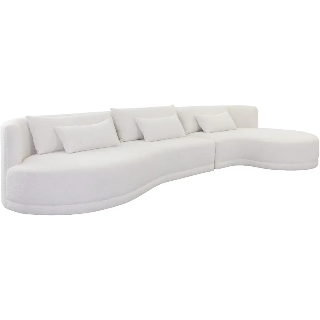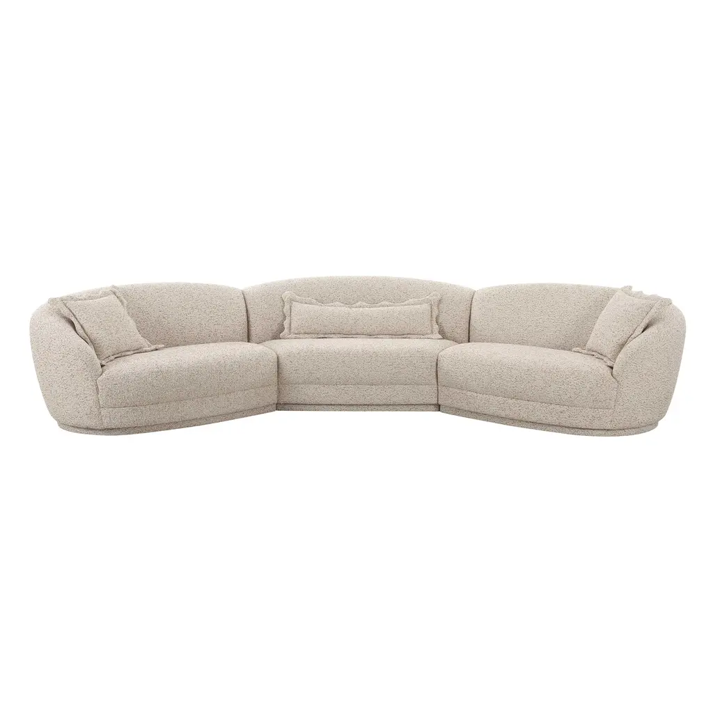 Introducing the Marion Two-Tone Textured Boucle Sectional, designed to shine from every angle; perfect for open living rooms where every side counts, even the back. Its playful, angled silhouette comes in two or three pieces, bringing both comfort and charm to your space. With graceful arched details and whimsical pillows, Marion is the must-have statement piece of the season.