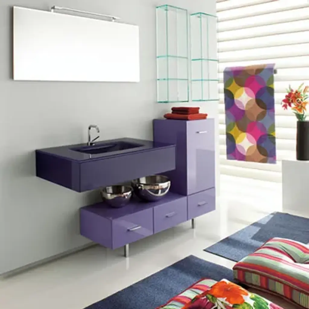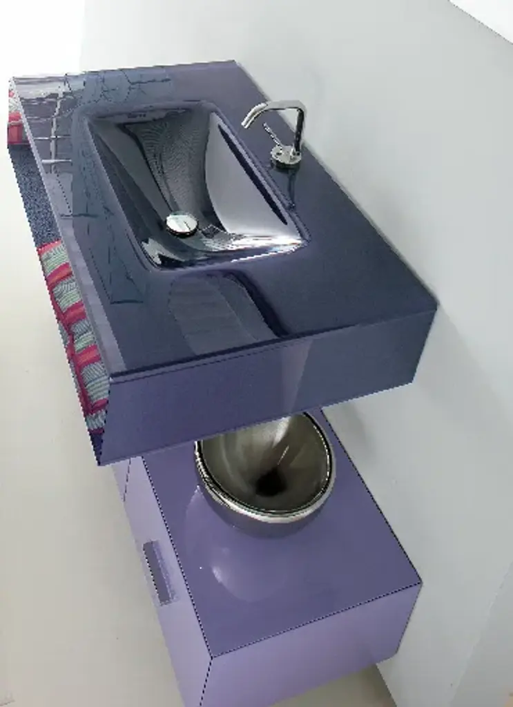 MARIPOSA 18 by Lasa Idea is a washbasin cabinet composed of:MA / 21 Chest of drawers -120 x 40 x H 38 cmMA / 30 Base - 40 x 40 x H 78 cmMA-04 Washbasin - 75 x 50 x H 16 cmBC-5 Mirror - 115 x 2 x H 50 cmCAS2 Wall lampFinish: periwinkle G77 glossy lacquered - periwinkle crystalElegant like a butterfly’s wings. The Mariposa collection is designed by Massimo Casprini and Alessandro Gordini and represents a new way of conceiving the bathroom ambient. The washbasins-top is the focal point of the collection and is available in wood, crystal and laminam. Made entirely of woodveneered multi-ply, fullyextractible alluminium blum drawers with“blumotion” return system.All the wooden element sare varnished with apolyester resin finish to guarantee total water resistance.