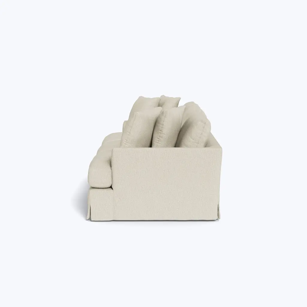 The Martha's Vineyard Slipped 104" Sofa, part of the iconic Cobble Hill collection and still a customer favorite at ABC Carpet & Home, brings a timeless, laid-back elegance to your living space. This extra-generous slipcovered sofa, measuring 104 inches, offers spacious seating perfect for stretching out or gathering with loved ones. With its relaxed, inviting feel, it’s ideal for long, cozy afternoons or casual gatherings.Handcrafted in the USA with a sustainably sourced Goodwood frame, the Martha's Vineyard 104" Slipped Sofa combines high-quality craftsmanship with eco-conscious design. The three seat and three back cushions are made from a luxurious feather-down blend, encased in soft ticking for optimal comfort and support. Four toss pillows add an extra layer of coziness, making this sofa the ultimate spot for lounging and relaxation.A key feature of this sofa is its slipcovered design, offering both practicality and beauty. The slipcover can be easily removed for cleaning or replaced to give your space a fresh look. Available in durable cotton and linen fabrics, the slipcover allows you to customize the sofa to suit your personal style, whether you prefer a classic, neutral palette or a more modern look.In addition to the 104" sofa, the Martha's Vineyard collection offers a variety of complementary pieces to suit your home’s unique needs. The collection includes the 74" apartment sofa, the two-seat 84" sofa, the 94" grand sofa, and additional items like the Martha's Vineyard chair and a half, ottoman, 135" sectional, and chaise. These pieces make it easy to create a cohesive and comfortable living space that reflects your individual style.With its blend of enduring style, practical design, and luxurious comfort, the Martha's Vineyard 104" Slipped Sofa is a perfect choice for those who value both beauty and functionality. Whether it's placed in a large family room or an open living area, this sofa offers the perfect balance of casual elegance and everyday comfort. Its relaxed charm, combined with superior craftsmanship, ensures it will be a timeless centerpiece in your home for years to come.