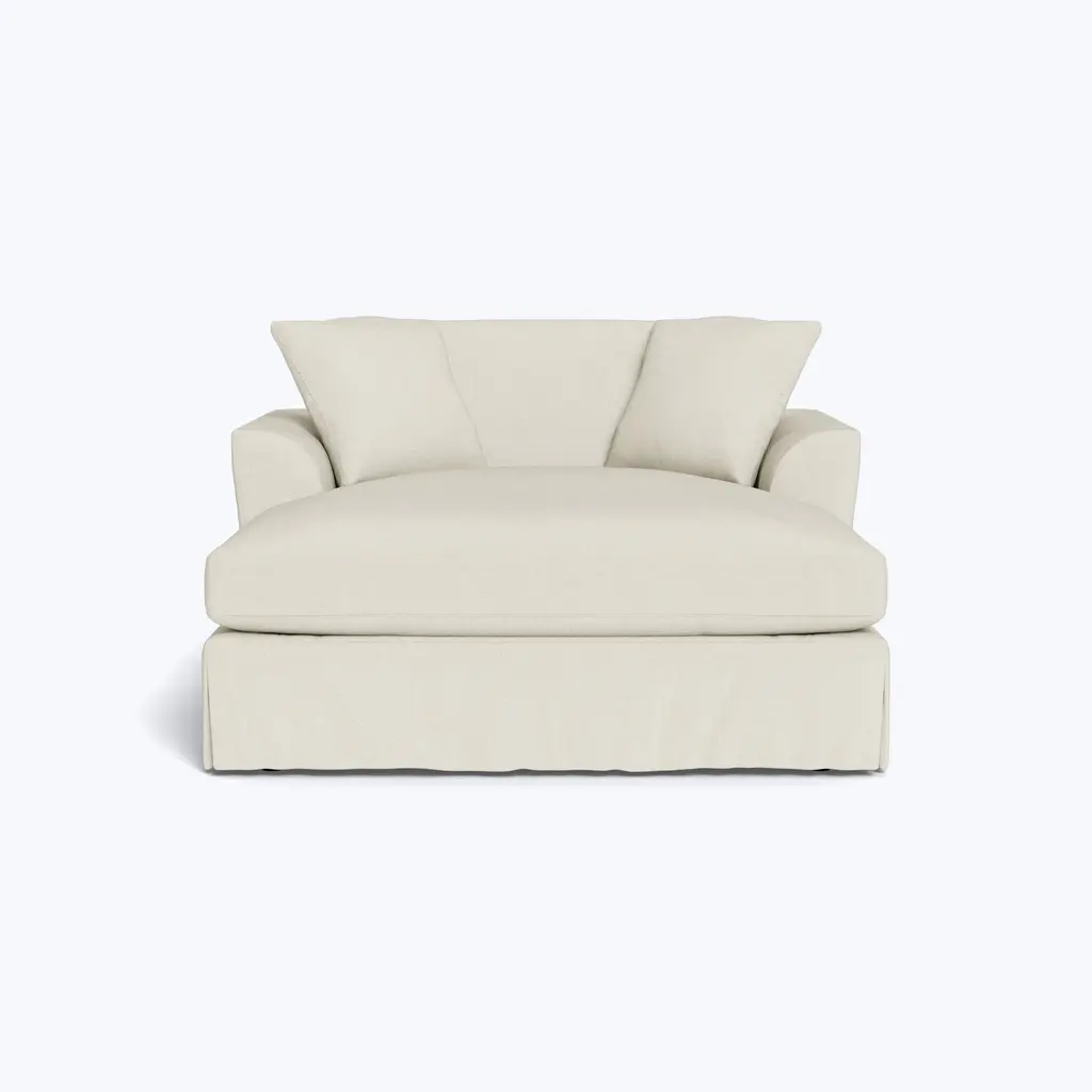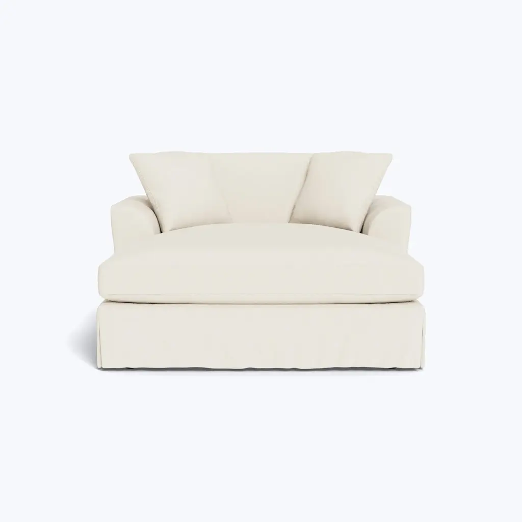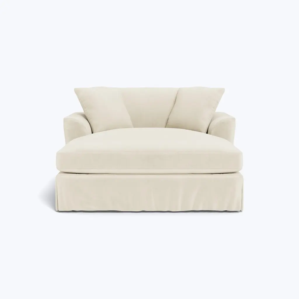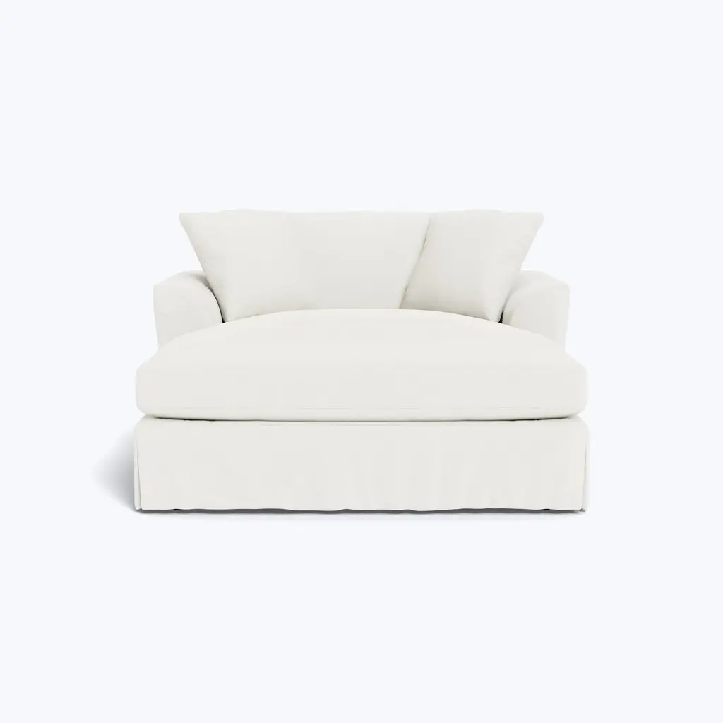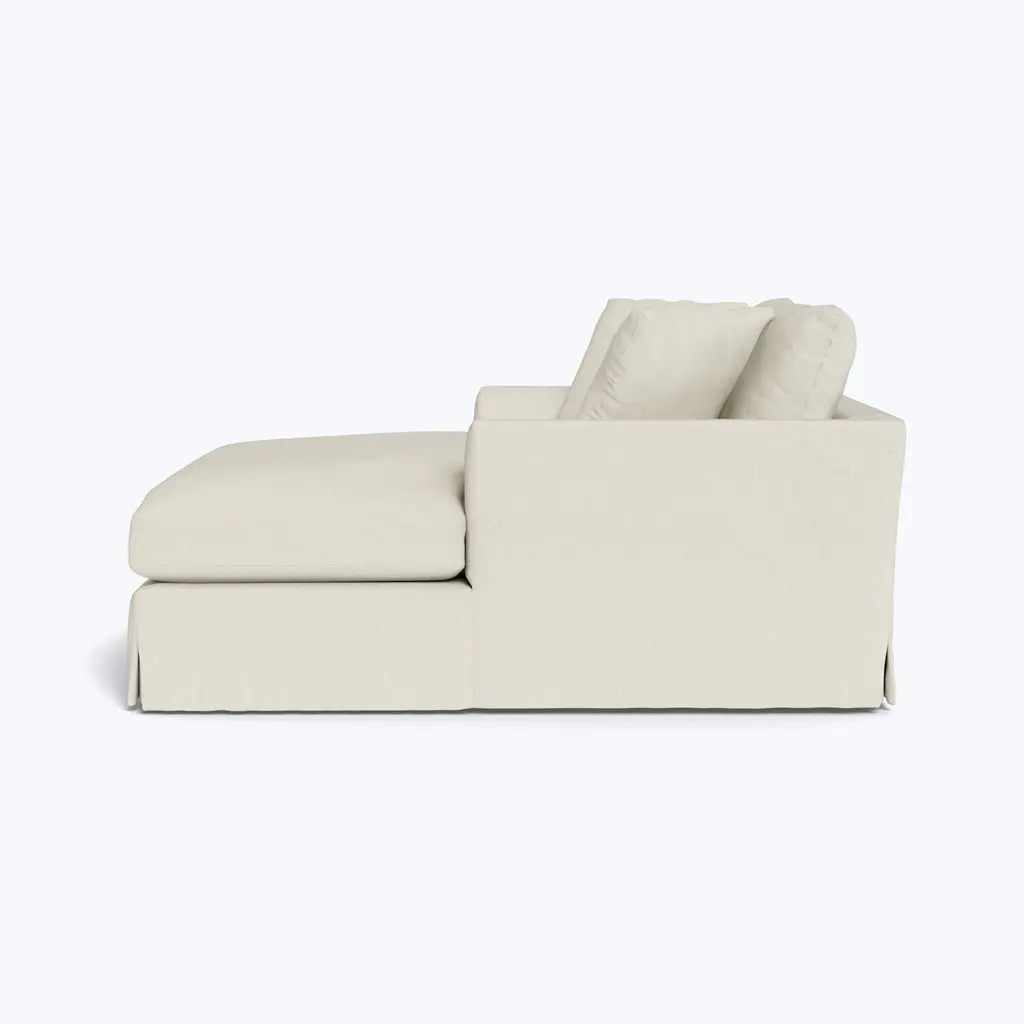 The Martha's Vineyard Chaise, part of the iconic Cobble Hill collection and a customer favorite at ABC Carpet & Home, offers the perfect blend of laid-back elegance and luxurious comfort. Measuring 59" W x 70" D x 36" H, this chaise provides a spacious, inviting spot for lounging, making it ideal for relaxing afternoons, reading, or simply stretching out in style. Handcrafted in the USA with a sustainably sourced Goodwood frame, the Martha's Vineyard Chaise combines eco-conscious craftsmanship with exceptional quality. The feather-down blend seat and back cushions, encased in soft ticking, deliver a plush, supportive feel, ensuring maximum comfort. Paired with toss pillows, this chaise invites you to sink in and unwind in total relaxation. One of the standout features of the Martha's Vineyard Chaise is its slipcovered design, offering both beauty and practicality. The slipcover can be easily removed for cleaning or replaced to refresh your space, making maintenance a breeze. Available in durable cotton or linen fabrics, the slipcover allows you to tailor the chaise to your personal style, whether you prefer a classic, neutral look or something more contemporary. In addition to the chaise, the Martha's Vineyard collection includes a variety of pieces to complete your living space. From the 104" grand sofa to the 135" sectional, chair and a half, and ottoman, each item is designed to create a relaxed, cohesive atmosphere in your home. The collection also features the 74", 84", and 94" slipped sofas, providing the same timeless charm in different sizes to suit various room layouts. With its blend of enduring style, practicality, and luxurious comfort, the Martha's Vineyard Chaise is a perfect choice for those who appreciate both beauty and functionality in their furniture. Whether placed in a living room, bedroom, or reading nook, this chaise offers a relaxed, elegant space to enjoy moments of rest and leisure, making it a cherished addition to any home.