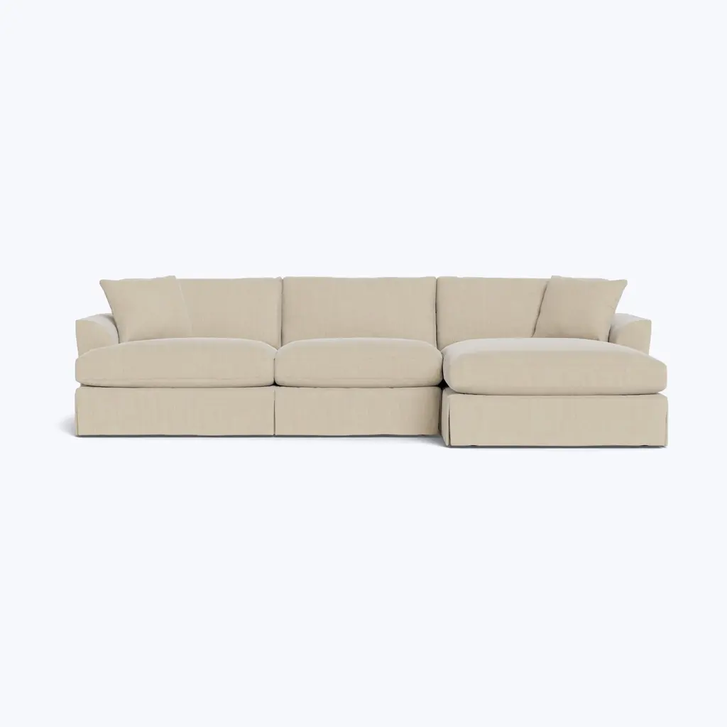 The Martha's Vineyard Slipped Sectional, part of the cherished Cobble Hill collection and a customer favorite at ABC Carpet & Home, brings a blend of laid-back elegance and modern functionality to your living space. Designed for those who value both style and comfort, this spacious 135" sectional offers ample room for family gatherings, movie nights, or stretching out in relaxed luxury.Handcrafted in the USA with a sustainably sourced Goodwood frame, the Martha's Vineyard Sectional combines eco-conscious craftsmanship with enduring quality. The feather-down blend cushions, encased in soft ticking, deliver plush support and exceptional comfort, while the included toss pillows add an extra layer of coziness. This sectional invites you to unwind and enjoy the moments that matter, whether alone or with loved ones.A standout feature of this sectional is its slipcovered design, offering both casual charm and practicality. The slipcovers can be easily removed for cleaning or replaced to refresh your space, making maintenance a breeze. Available in durable cotton or linen fabrics, the slipcover allows you to customize the look of your sectional, whether you prefer classic neutrals or a contemporary palette.In addition to the sectional, the Martha's Vineyard collection includes a variety of pieces to create a cohesive living space. The collection offers options like the 104" grand sofa, 74", 84", and 94" slipped sofas, as well as the chair and a half, ottoman, and chaise, all designed to enhance the relaxed, coordinated feel of your home.With its blend of timeless style, practical design, and luxurious comfort, the Martha's Vineyard Sectional is a perfect choice for those who want a living space that’s as beautiful as it is functional. Whether you're entertaining guests or enjoying a quiet evening, this sectional offers the perfect balance of casual elegance and everyday ease, making it a centerpiece for any home.
