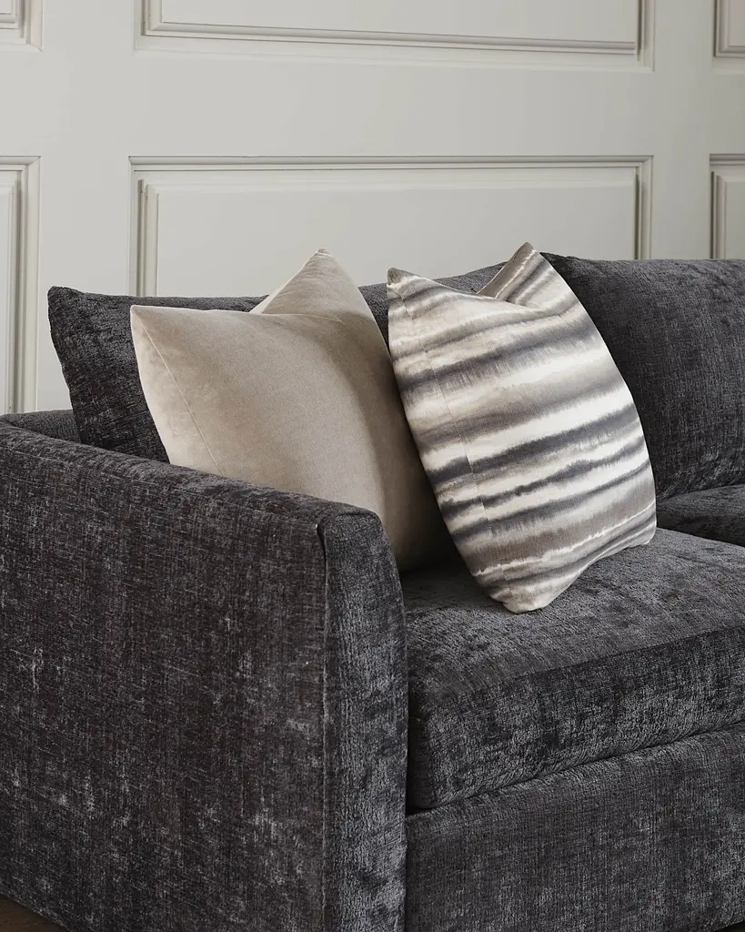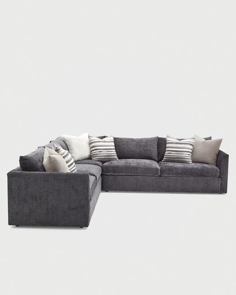 Sectional sofa handcrafted of hardwood solids, poly blend, and cotton Includes 6 toss pillows: (3) 22" Sq. striped pillows, cotton/linen; (2) 22" Sq. solid gray pillows, polyester/cotton; (1) 22" Sq. ivory pillow, polyester Light assembly required to attach sectional pieces Overall, approx. 252"W x 40"D x 36"T 3-piece set; corner section and two love seats Outer width of each side, 126" Overall outer width, 252" Seat width, 184" Seat depth, 24" Seat height, 19" Finished back Weight, 540.0lbs Made in USA from imported materials Frequest vacuuming, dry clean if needed Boxed weight, approximately 550.0lbs Shipping Direct from Vendor, usually ships within 90 business days. About Massoud: Company president Chuck Massoud's father combined his entrepreneurial spirit with loans from three friends to start Massoud Furniture in 1963. Since then, the Massoud family has been crafting its distinctive brand of custom seating. Massoud is credited for putting pitch in their wing chairs—leaning them back slightly makes them so much more comfortable than the classic wing chair with a straight back. All Massoud furniture features kiln-dried hardwood frames and the finest leathers and fabrics available. They also employ multiple support rails, reinforced corner blocks, mortise-and-tenon joinery, and suspended coil systems for comfort and quality craftsmanship that lasts a lifetime.