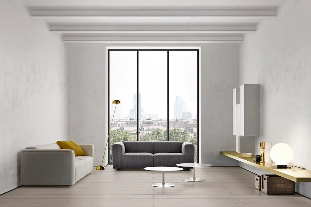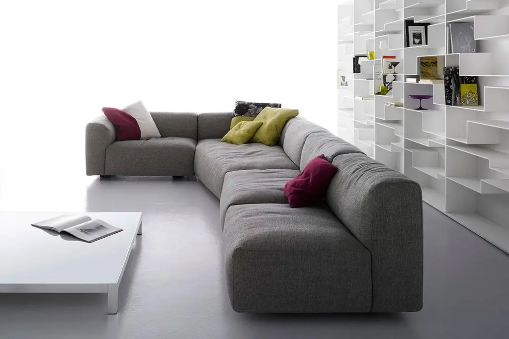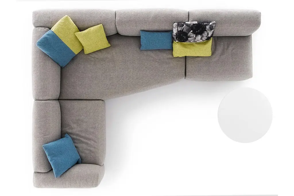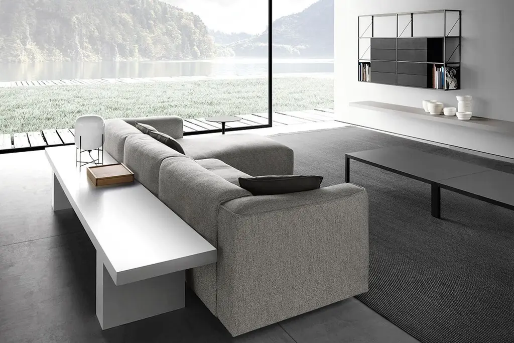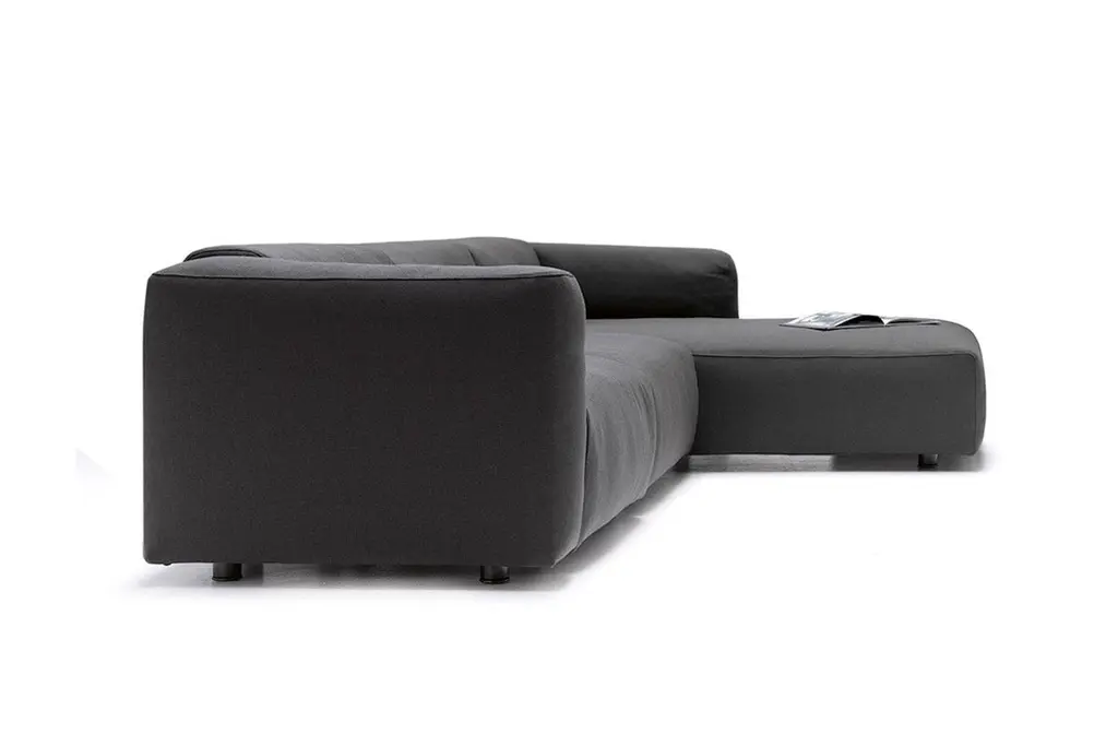 A system of sofas and sectionals. With a frame in solid wood and elastic belts and a filling in indeformable variable-density polyether and down, or in polyester wadding. The new top stitched seam highlights the arms in the end, corner and special units. PULL-OUT ELEMENTSWith the 95 cm large intermediate element and the 119 cm large end element with armrest, a sliding system allows to increase the seat depth by 18 cm for a better comfort.COVERThe fabric cover is specially made for maximum softness and covers every part of the sofa.Completely removable.