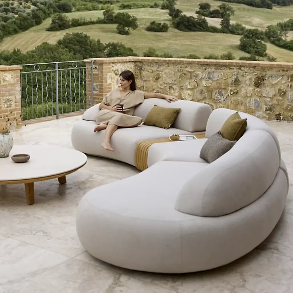 The Mellow Outdoor Long Backrest Module Sofa from Cane-line offers extended support through its tall, curved backrest that wraps around users. This end module creates natural resting points while maintaining the collection's fluid lines. The substantial backrest height enhances comfort during longer seating periods, built on a lightweight aluminum frame for weather resistance. AirTouch upholstery maintains breathability while repelling moisture, with integrated drainage preventing water accumulation. Its generous dimensions accommodate various seating positions, from upright conversation to relaxed lounging, adding visual interest to sectional configurations.