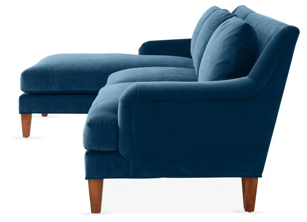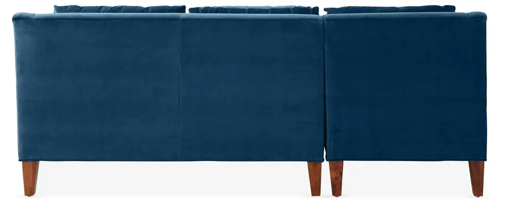Designed by us and available only at One Kings Lane: This luxe sectional is perched on exposed hardwood legs in a rich chestnut finish, detailed with English arms, and upholstered in statement-making peacock velvet. The back cushion is filled with feathers, down, and fiber encased in channeled down-proof ticking, while the sturdy seat is filled with individually pocketed coils encased in foam. The foam is then wrapped in a blanket of feathers, down, and polyester fibers and put into a channeled down-proof ticking. Made in the USA.