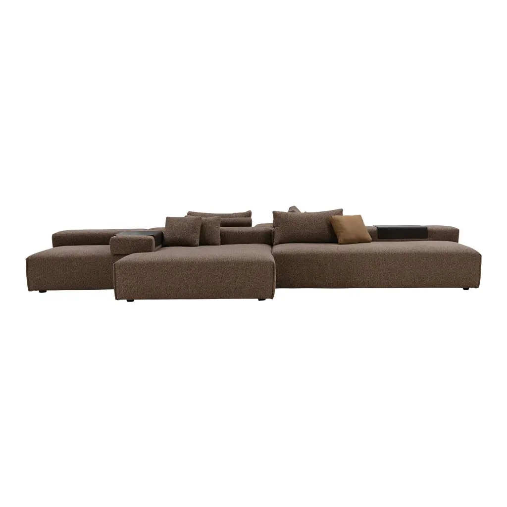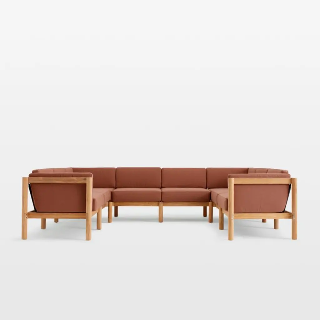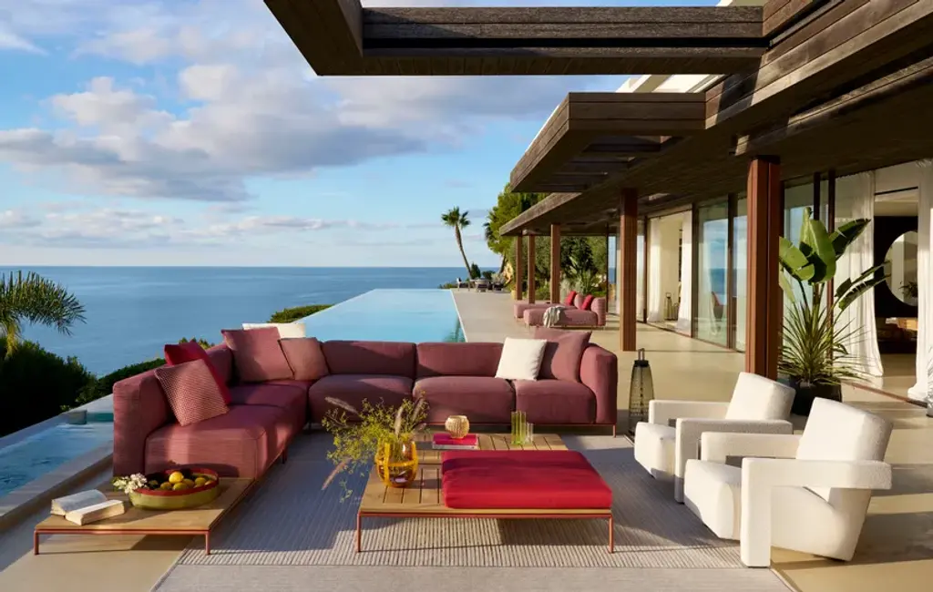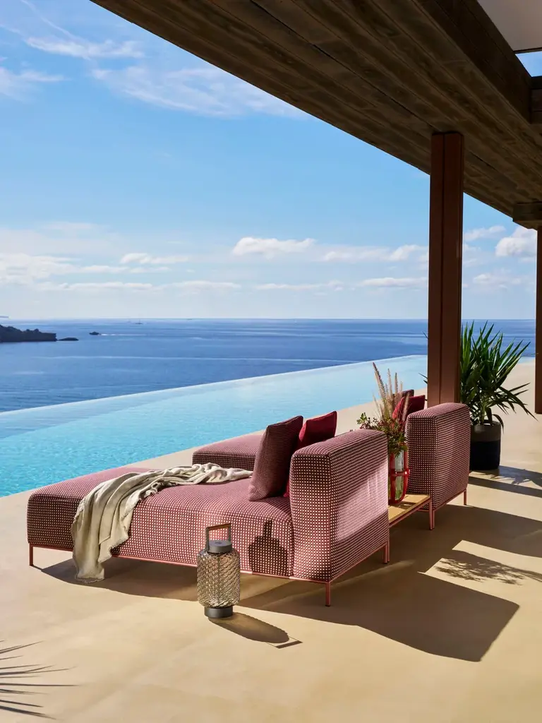 MEX HI OUTDOOR is a sectional fabric garden sofa with removable cover.MaterialsTubular AISI 304 stainless steel base outdoor powder-coated in taupe, ivory, green, terracotta;Cataphoresis treated tubular steel frame fitted with elastic belting;Cushions with polyurethane foam padding with differentiated density polyurethane inserts, made with a percentage of polyols derived from biological sources, covered in recycled PET fibre wadding, coupled with water-repellent canvas;Removable fabric upholstery;Low table top in solid natural Iroko wood slats or ivory glazed porcelain stoneware;Low table mattress in polyurethane covered with recycled PET fibre wadding coupled with water-repellent canvas.The ample forms and essential lines of Mex-Hi, the modular sofa system designed by Piero Lissoni, blend with new materials and finishes in a new collection studied specifically for outdoor use. Thanks to three different sized bases that can be combined to create versatile and dynamic compositions. The system is enriched with a larger three-seater sofa that can be used as an independent element, together with a cosy daybed to laze around and sunbathe by the pool. A solid Iroko wood top can be added onto the frame’s base to form a functional integrated coffee table, creating a harmonious interplay of textures. This wood essence immediately gives the system a warmer feel for a welcoming and relaxing ambience. To complete the Mex-Hi Outdoor system, three free-standing side tables, with the same metal frame, are also available with a solid Iroko wood slatted top or in ivory glazed porcelain stoneware. It is also possible to place a mattress on top of each table to transform it into a comfortable seat, further emphasising its functionality. The cosy padded seat of the Mex-Hi Outdoor, made of recycled PET fibre wadding and polyurethane with a percentage of polyols derived from biological sources, is protected by a water-repellent canvas to prevent water from permeating inside. The upholstery’s new textured weaves wrap around the system’s shapes while a selection of evocative colours recall Mediterranean landscapes. Made for outdoor use, the sophisticated metal structure that holds the soft upholstered elements is presented in four new shades: taupe, ivory, green and terracotta. The cushions have also been usefully developed to be easily removed from the structure for maintenance or washing.