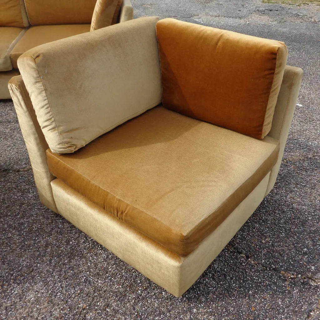 Modern velvet modular sectional sofaStunning low profile sofa in rich gold velvet. Modular pieces that can be used apart or as a 120" sofa.Matching ottomans. 2 sofas available. Price is per sofa.Measures: 120"W x 32"D x 31"HSeat Height: 15".