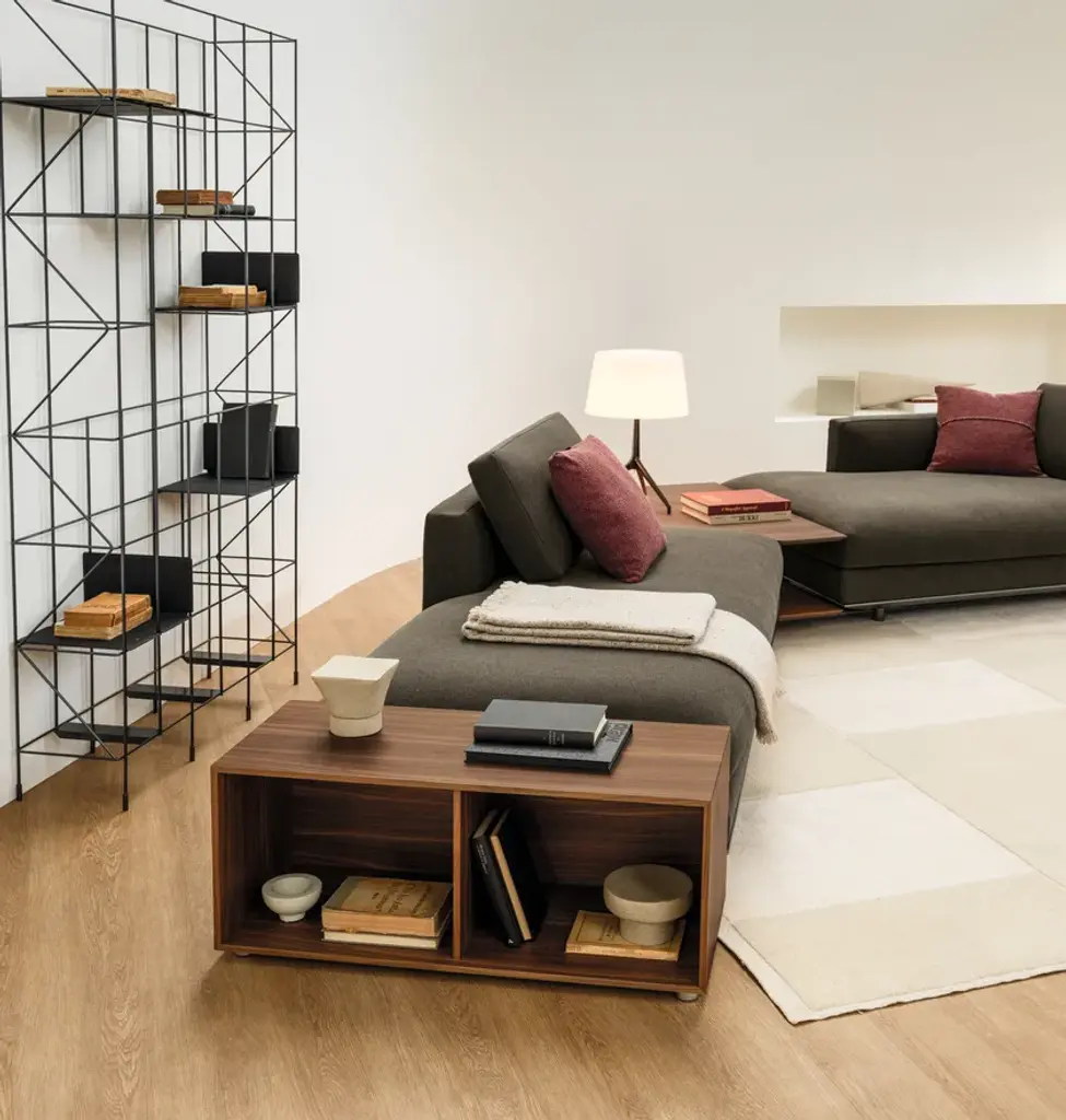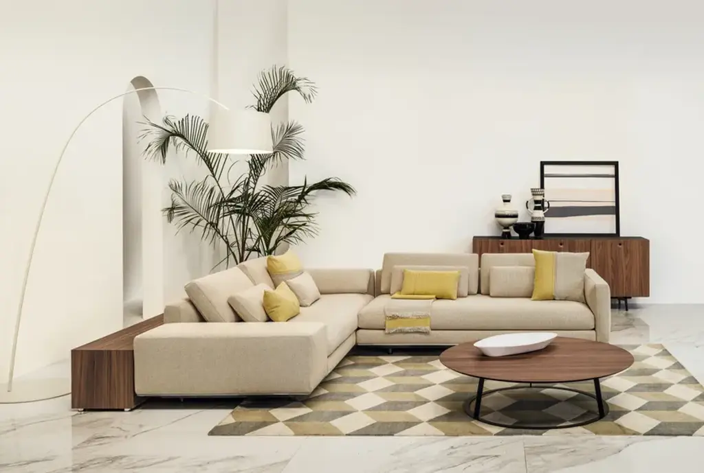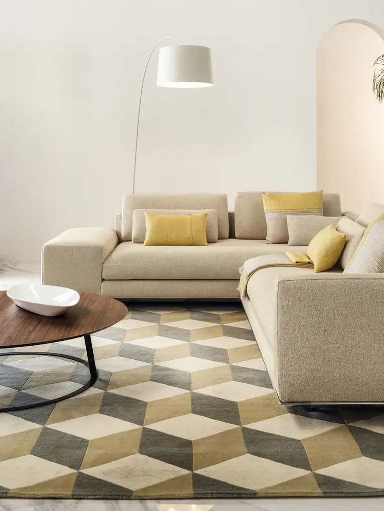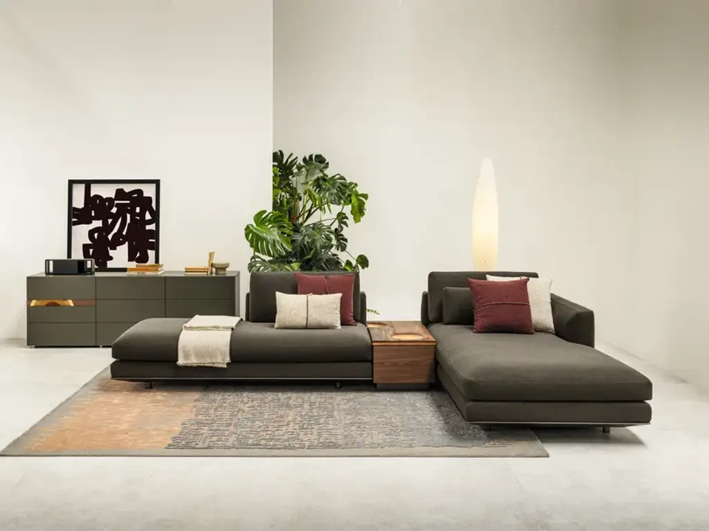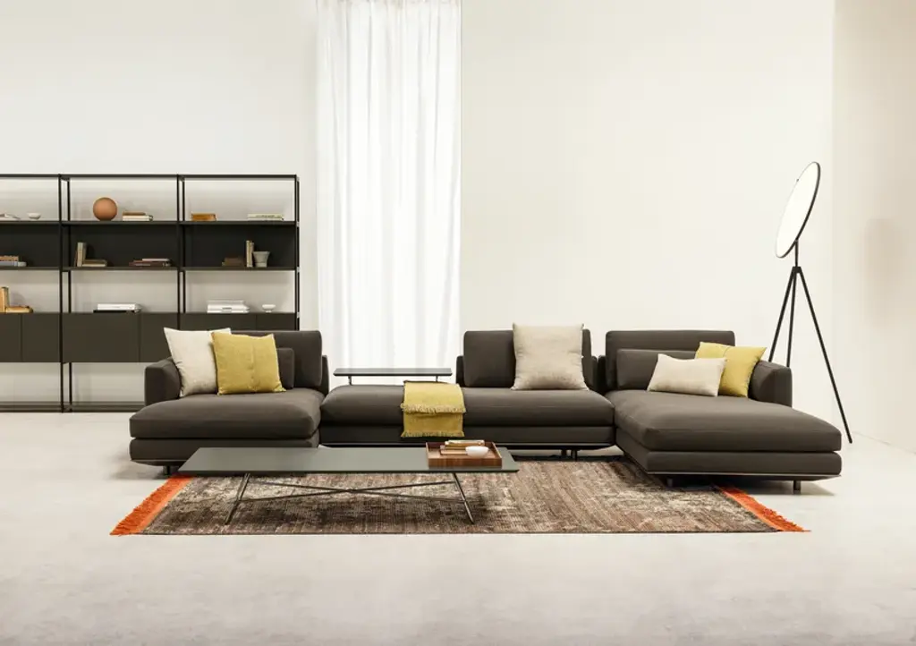 Miles is a sectional fabric sofa, also available in leather or eco-leather.Miles features two thin cushions, resting on an upholstered and straped base, with hidden aluminium foot (7cm), and is available in two seat depths: 90 or 105cm.Backrests and armrests structure made of solid wood and plywood covered with variable density polyurethane foam.Seat cushions in non-deformable, high-resilience, and variable density polyurethane foam. They rest on high rubber content elastic webbing inserted in the aluminium frame.Back cushions in high resilience, variable density polyurethane foam.To facilitate removal of the covers, the armrests and backrests can be removed from the frame by means of a quick coupling and release system.Aluminium frame and feet, finish: polished, bronze, brick