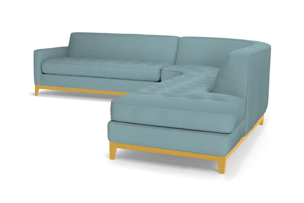 The Monroe Drive Collection is a modern update of our show-stopping Monroe Collection. The same eye-catching Mid Century Modern design details that defined the Monroe are still on display, but now with the addition of a stunning, solid wood base. The sophisticated button-tufted cushions and sleek tight back make The Monroe Drive look like it came straight from a classic Hollywood film set. The contemporary base creates a handsome, formal profile that allows the Monroe Drive to feel right at home in a variety of different decor styles. Available in your custom choice of our kid friendly and pet friendly fabrics, the Monroe Drive is perfect for your family home or your sophisticated apartment.With a Mad Men-esque silhouette, The Monroe is a perfect way to add a hip factor to any room. The clean lines and simple round couch shape make it perfect for any small space. It packs a big punch without taking up a lot of square footage.