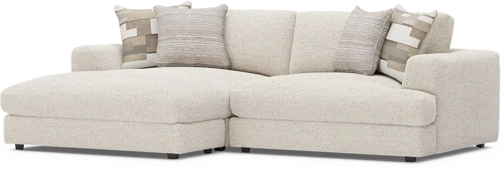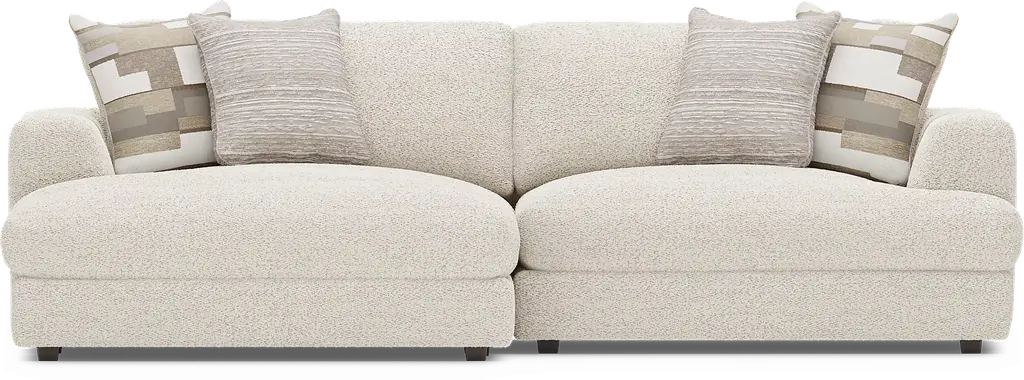 A cozy invitation to unwind and enjoy a warm, comfortable embrace with a dose of casual cool are just the beginning when it comes to the Drew & Jonathan Montecito modular sectional. A versatile centerpiece with family-friendly style, this laid-back contemporary set offers seat cushions with a plush custom blend of feathers, fiber and down surrounding a supportive foam core for comfort that’s soft yet structured, all upholstered in striking white chenille. Oversized wedge arms and extra-wide seats complete the look with plenty of room to spare. Plus, this sectional has the flexibility to be reconfigured, again and again, to fit your changing needs and taste. Upholstery: 100% Polyester.