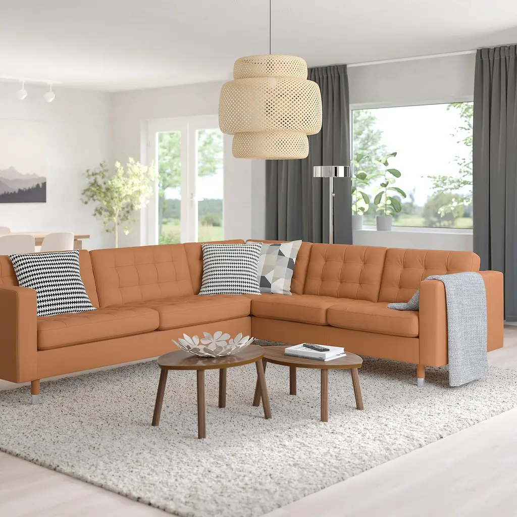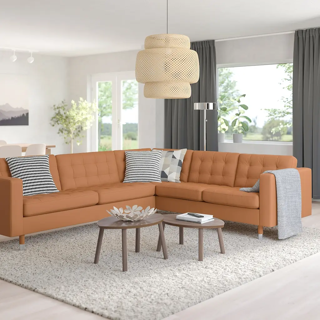MORABO Sectional, 5-seat corner - Grann/Bomstad golden brown/metal. Seat cushions filled with high-resilience foam and polyester fiber wadding provide great seating comfort. Removable armrests make it easy to add on a chaise lounge.