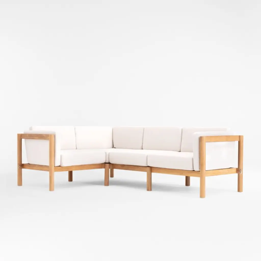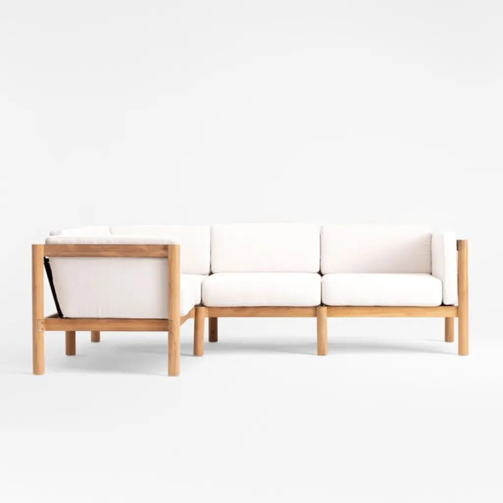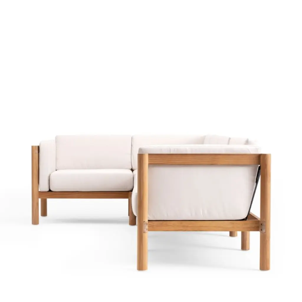 Space-saving yet deep-seated, this sectional sofa invites family and friends to kick back and enjoy the great outdoors. Boxy seat and back cushions are curl-up comfy, while the four-piece sectional's slim side bolsters add a soft layer for draping arms. Grade A teak shapes the chunky, rounded frames complemented by hand-stretched polyester rope backs that angle slightly for a comfortable recline. Offering living-room looks with surprising durability, the right-angled outdoor sectional withstands the elements in weather-resistant teak and fast-drying foam cushions.By choosing FSC ®-certified furniture, you are supporting responsible management of the world's forests.Based in Phoenix, Neighbor crafts beautiful, durable furniture for outdoor living with premium materials such as Sunbrella fabrics and FSC-certified teak. We're thrilled to partner with Neighbor in bringing you Haven, one of the company's first collections designed to build connection and expand livable square footage to outdoor spaces.