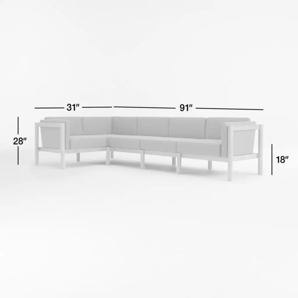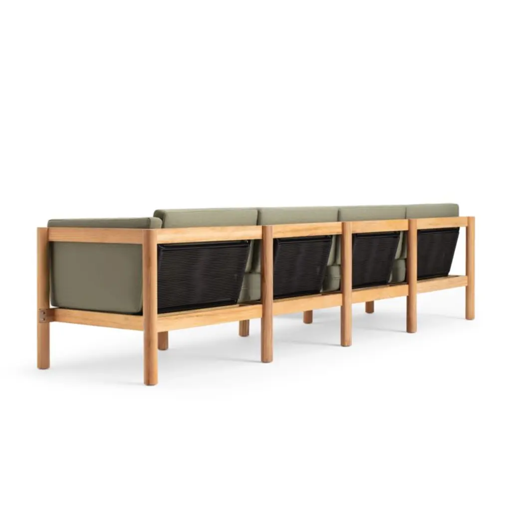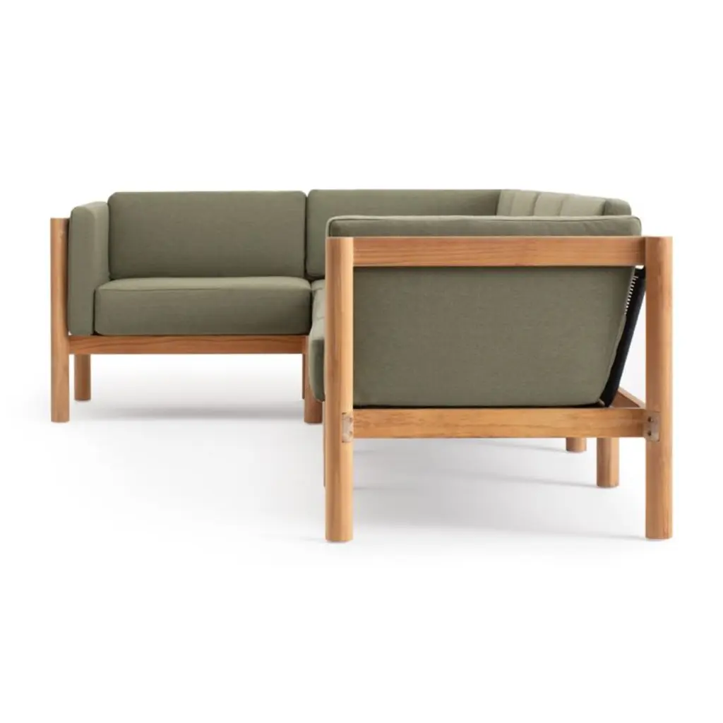 Space-saving yet deep-seated, this sectional sofa invites family and friends to kick back and enjoy the great outdoors. Boxy seat and back cushions upholstered in sage green are curl-up comfy, while the sectional sofa's slim side bolsters add a soft layer for draping arms. Natural teak shapes the chunky, rounded frames complemented by hand-stretched polyester rope backs that angle slightly for a comfortable recline. Offering living-room looks with surprising durability, the right-angled outdoor sectional withstands the elements in weather-resistant teak and fast-drying foam cushions.Based in Phoenix, Neighbor crafts beautiful, durable furniture for outdoor living with premium materials such as Sunbrella fabrics and FSC-certified teak. We're thrilled to partner with Neighbor in bringing you Haven, one of the company's first collections designed to build connection and expand livable square footage to outdoor spaces.By choosing FSC ®-certified furniture, you are supporting responsible management of the world's forests.