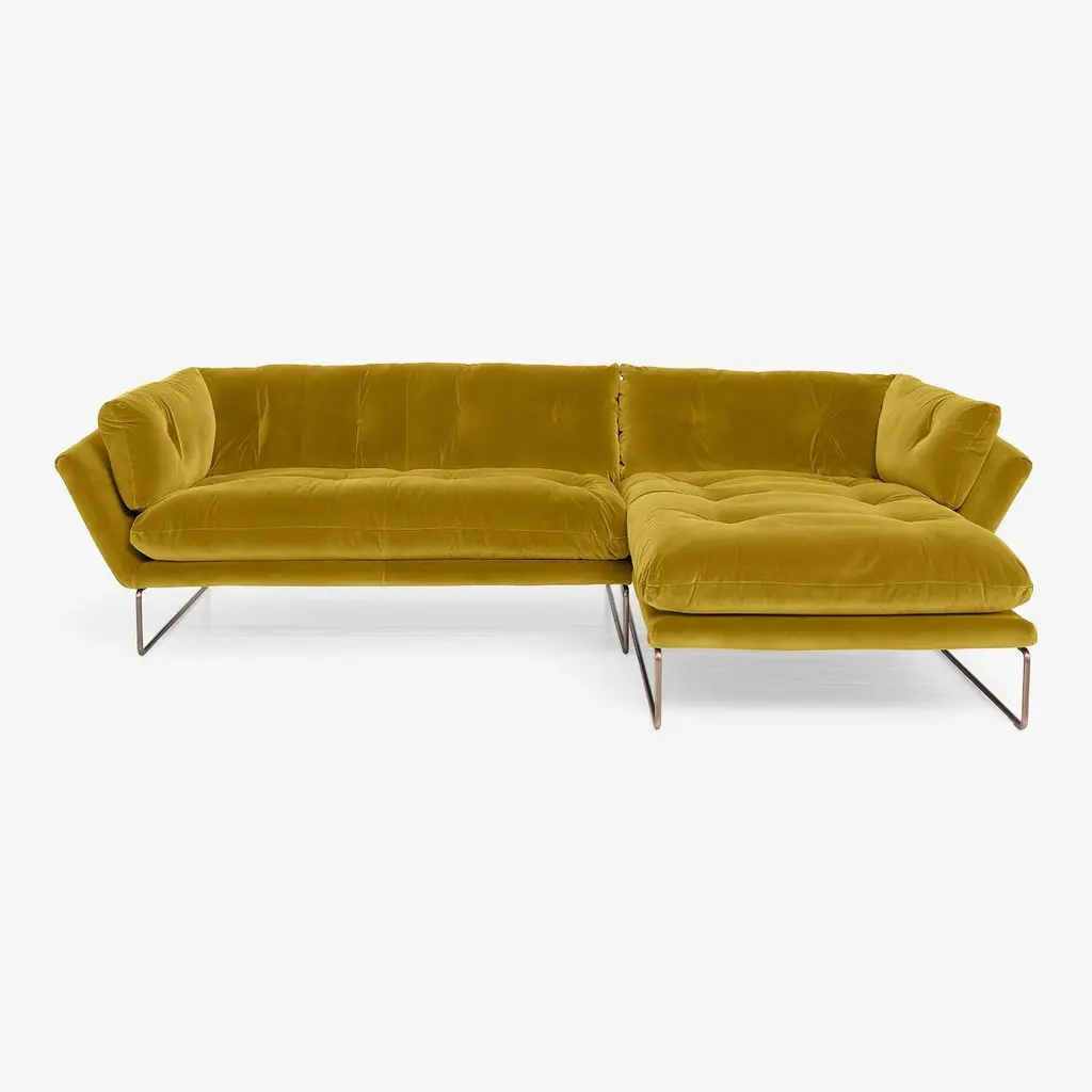 Embrace the art of modern design with the New York Collection, where contemporary innovation seamlessly intertwines with timeless elegance. This collection features quilted cushions that evoke a sense of retro sophistication, enveloping you in nostalgia while pushing the boundaries of futuristic aesthetics. The striking hexagonal shape of the frame, elegantly supported by slim steel rod feet, enhances its metropolitan allure, beautifully reflecting our love for sacred geometry. The New York Suite Sectional is characterized by its captivating low-slung design, inviting a sense of tranquility and style. Enveloped in luxurious velvet cotton upholstery, this sectional beckons you to sink into its embrace. Resting atop a sturdy metal base, it elevates the allure of the piece, anchoring its modern design with sophistication. Crafted for both style and practicality, the sectional includes a removable slipcover, making cleaning effortless and allowing you to refresh your space with ease. Handmade in Italy, this piece embodies the renowned craftsmanship and artistry inherent in Italian furniture-making traditions. Measuring 110 inches in width, 65 inches in depth, and 29.5 inches in height, this sectional provides ample seating for you and your guests to lounge in unparalleled comfort. Fashioned from 100% Italian velvet cotton, it exudes opulence while ensuring durability and longevity. Make a statement in your home with the New York Suite Sectional, the epitome of luxury and sophistication, ideal for both residential and contract environments. Choose from a variety of rich velvet hues, or visit us at 888 Broadway to work with a design specialist who can help you select from an extensive range of sizes and fabrics to create your perfect piece.