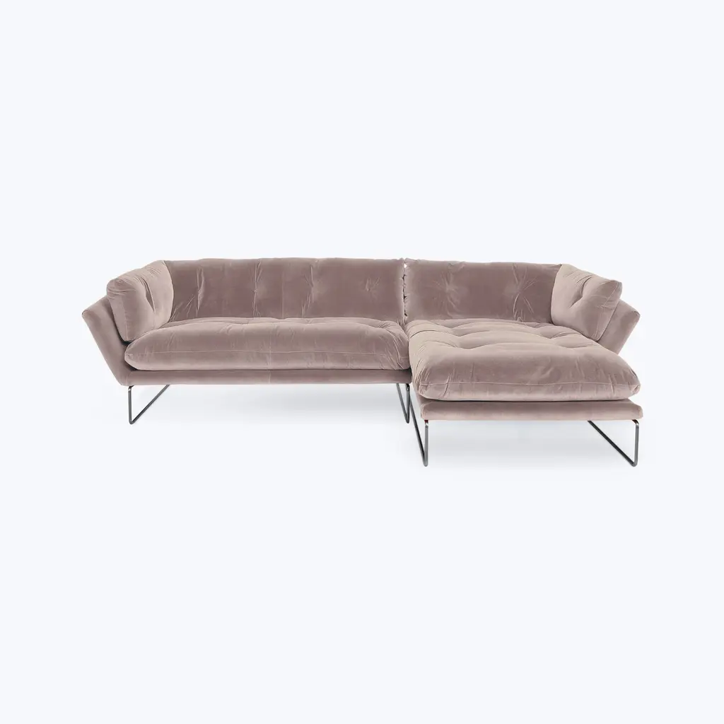 Embrace the art of modern design with the New York Collection, where contemporary innovation seamlessly intertwines with timeless elegance. This collection features quilted cushions that evoke a sense of retro sophistication, enveloping you in nostalgia while pushing the boundaries of futuristic aesthetics. The striking hexagonal shape of the frame, elegantly supported by slim steel rod feet, enhances its metropolitan allure, beautifully reflecting our love for sacred geometry. The New York Suite Sectional is characterized by its captivating low-slung design, inviting a sense of tranquility and style. Enveloped in luxurious velvet cotton upholstery, this sectional beckons you to sink into its embrace. Resting atop a sturdy metal base, it elevates the allure of the piece, anchoring its modern design with sophistication. Crafted for both style and practicality, the sectional includes a removable slipcover, making cleaning effortless and allowing you to refresh your space with ease. Handmade in Italy, this piece embodies the renowned craftsmanship and artistry inherent in Italian furniture-making traditions. Measuring 110 inches in width, 65 inches in depth, and 29.5 inches in height, this sectional provides ample seating for you and your guests to lounge in unparalleled comfort. Fashioned from 100% Italian velvet cotton, it exudes opulence while ensuring durability and longevity. Make a statement in your home with the New York Suite Sectional, the epitome of luxury and sophistication, ideal for both residential and contract environments. Choose from a variety of rich velvet hues, or visit us at 888 Broadway to work with a design specialist who can help you select from an extensive range of sizes and fabrics to create your perfect piece.