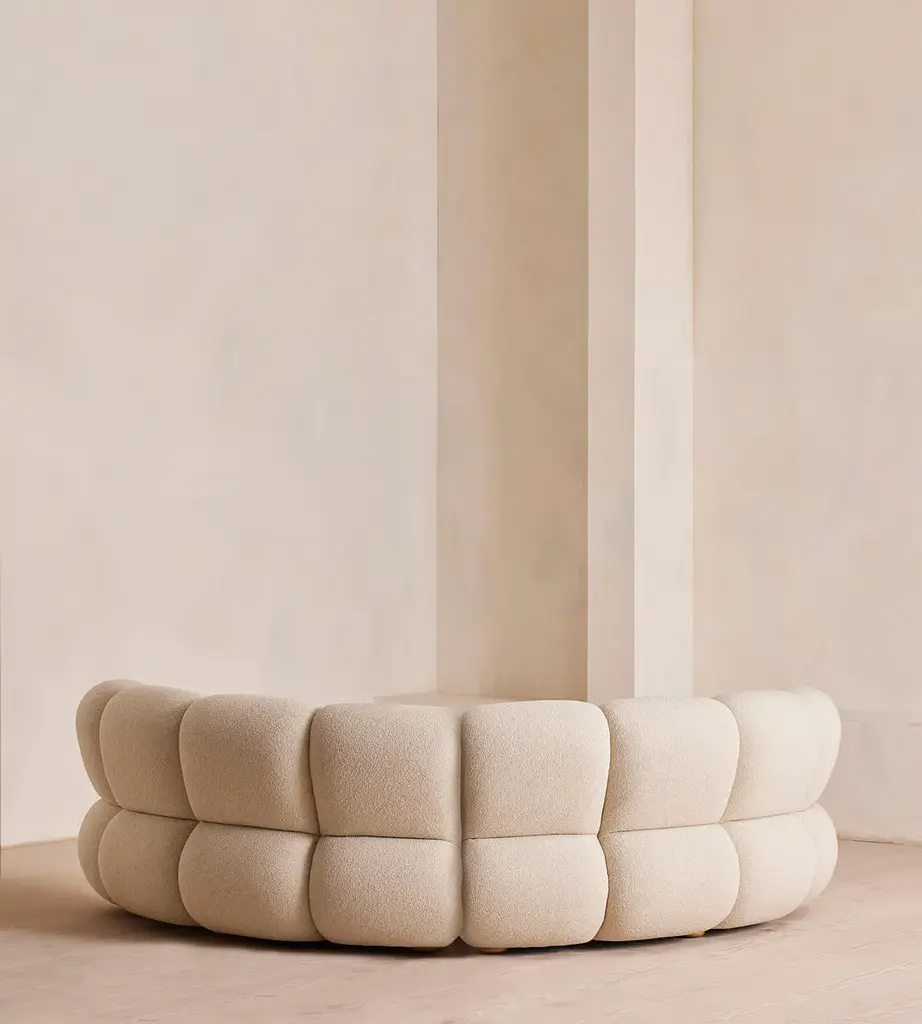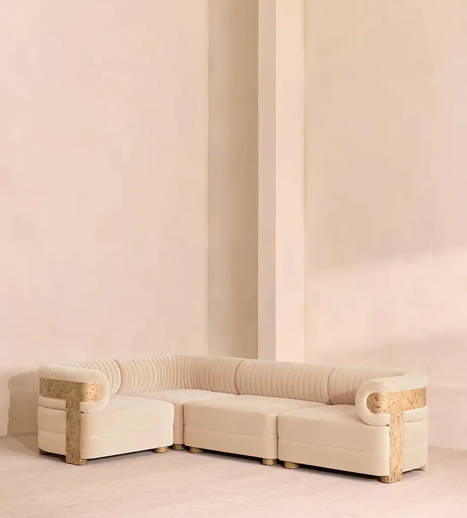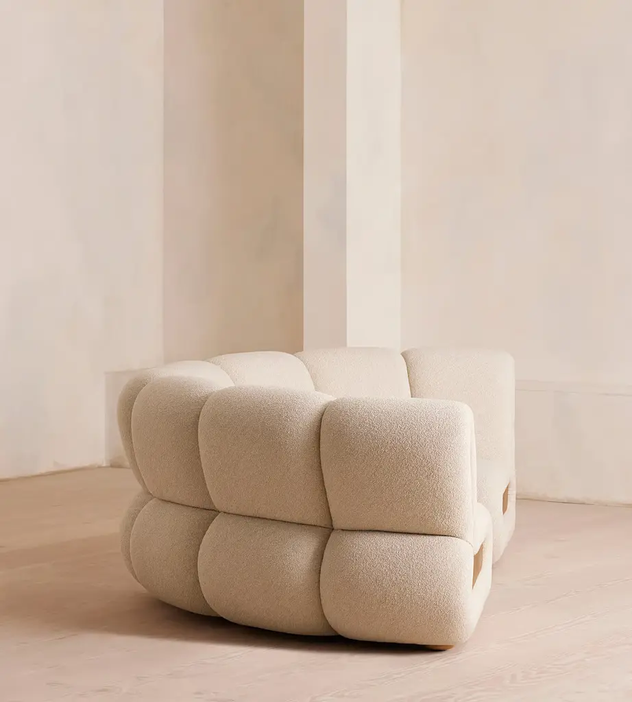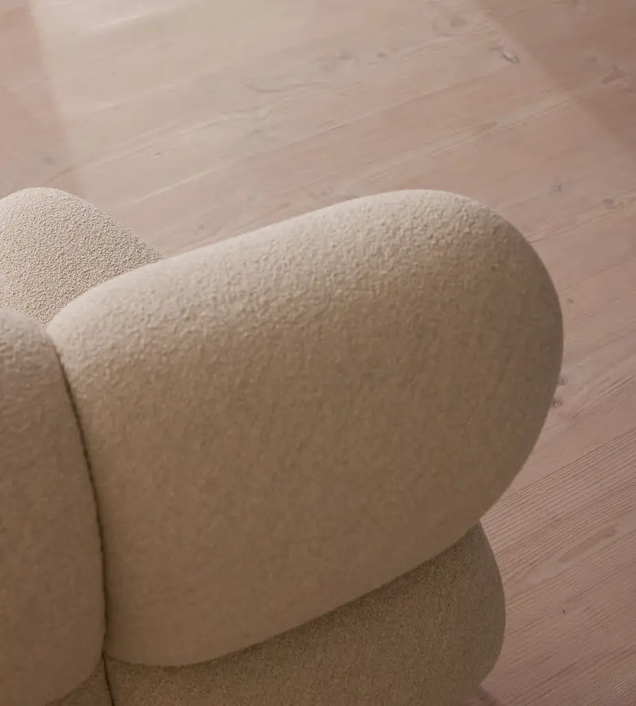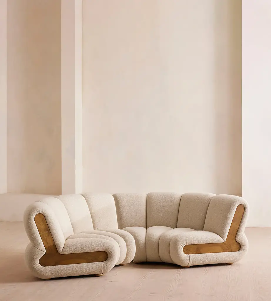 Designed to adapt to any living space, the Noelle sectional sofa comprises of straight and curved sections to create the shape you desire, or alternatively a generous armchair if used alone. Boucle upholstery is complemented with aged Pippy Oak veneer sides that have a burl finish, while its statement curved shape takes its design cues from the 1970s interiors of 180 House.