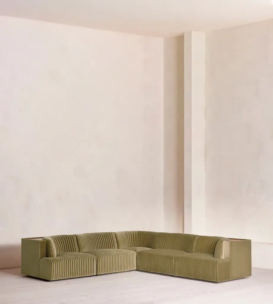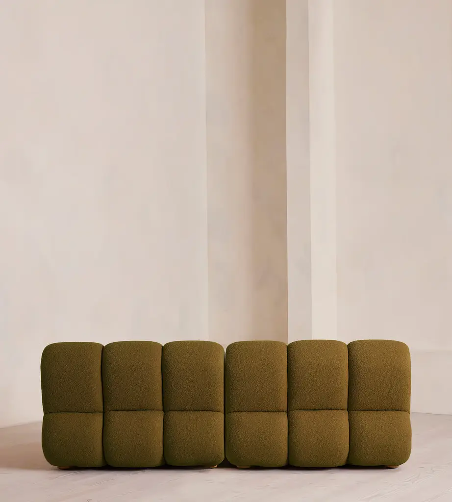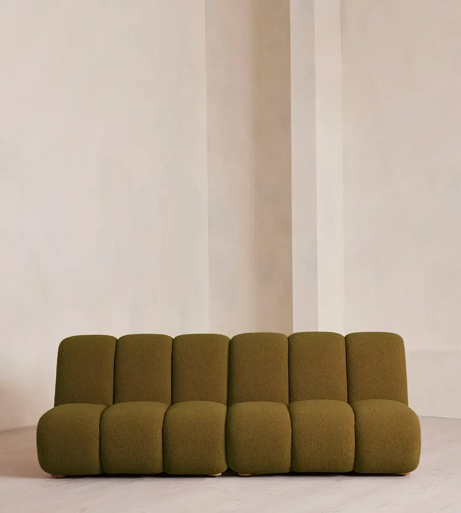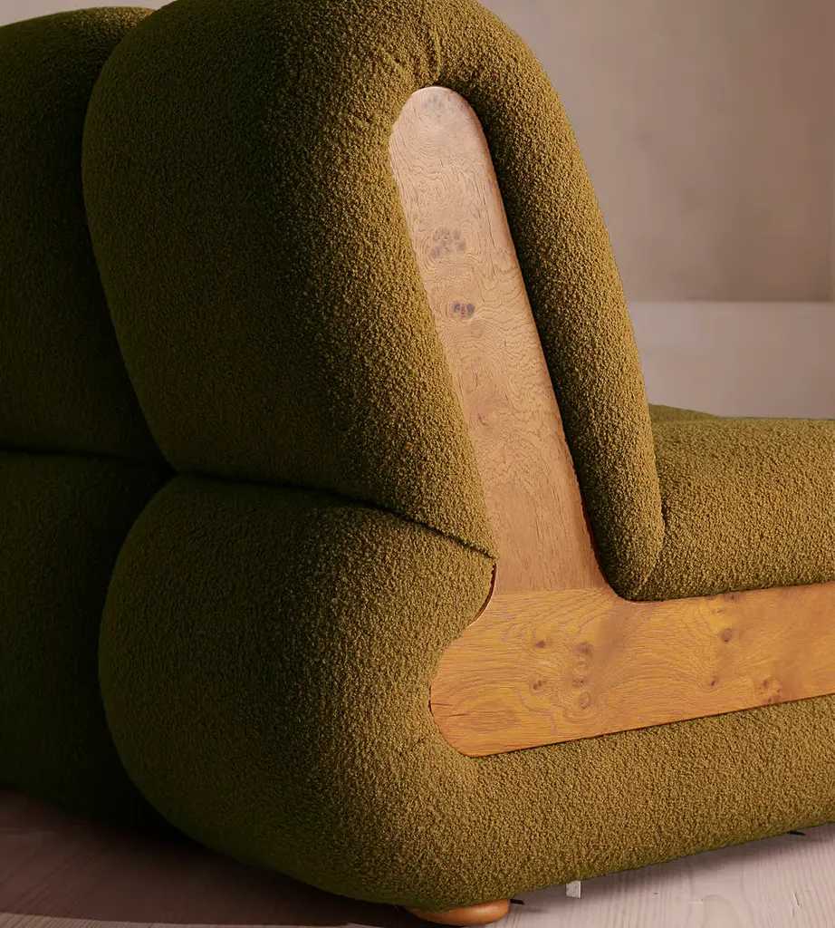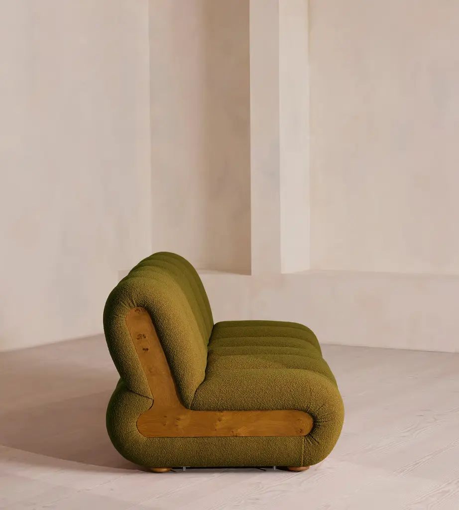 Fully upholstered in boucle with Pippy Oak sides, the modular design of this statement sofa is made to adapt to any living space. Designed to integrate into your living area or social space, the four-seater Noelle sofa includes two curved armchair module units that let you create the shape you desire. Taking design cues from the interiors of 180 House, its comfortable silhouette is complemented by aged Pippy Oak sides with a burl finish.