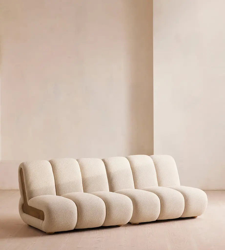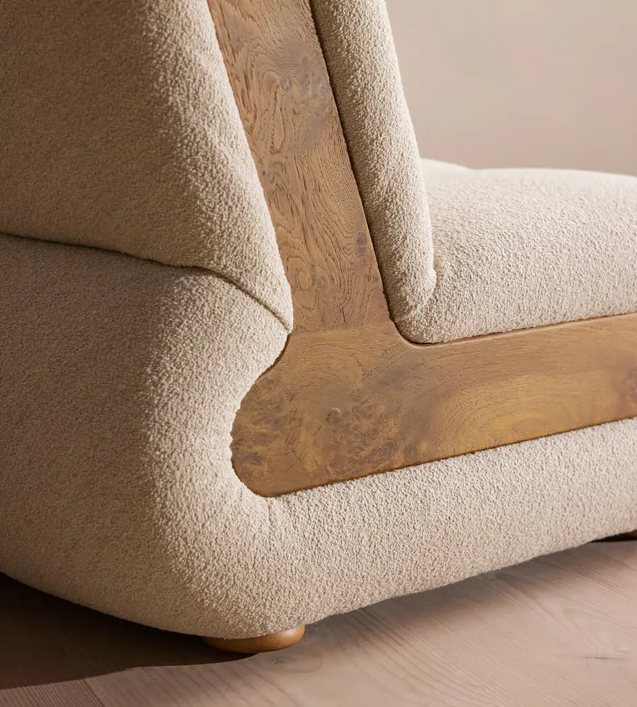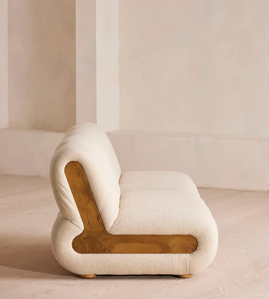Designed to adapt to any living space, the Noelle sectional sofa comprises of straight and curved sections to create the shape you desire, or alternatively a generous armchair if used alone. Boucle upholstery is complemented with aged Pippy Oak veneer sides that have a burl finish, while its statement curved shape takes its design cues from the 1970s interiors of 180 House.
