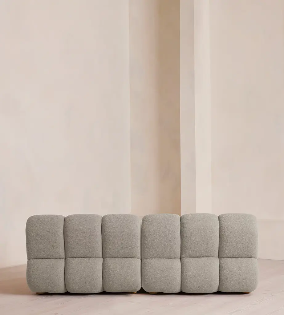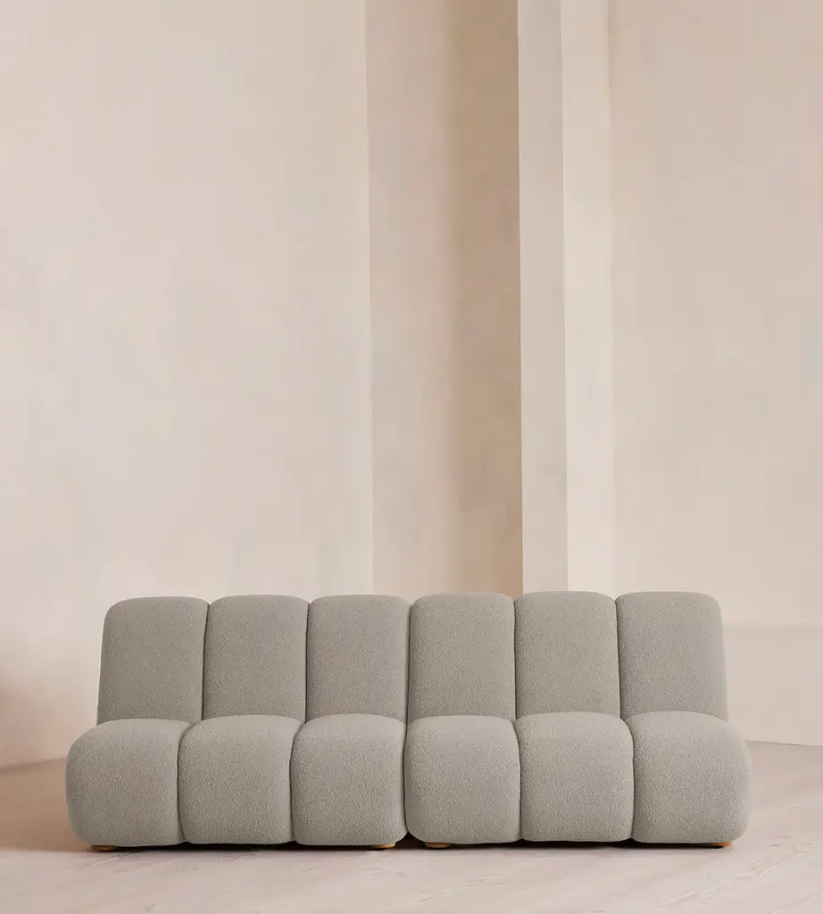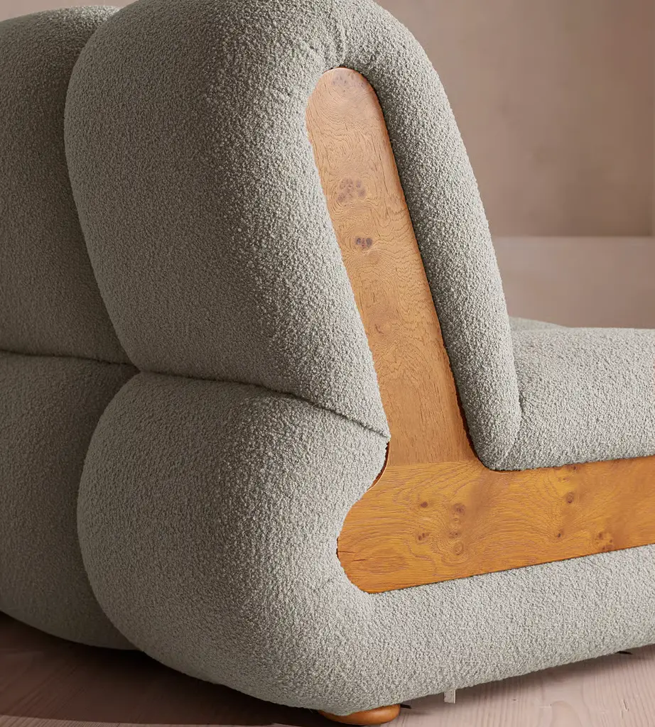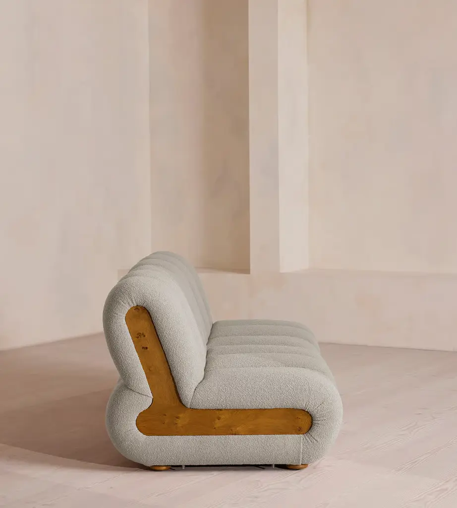 Fully upholstered in boucle with Pippy Oak sides, the modular design of this statement sofa is made to adapt to any living space. Designed to integrate into your living area or social space, the four-seater Noelle sofa includes two curved armchair module units that let you create the shape you desire. Taking design cues from the interiors of 180 House, its comfortable silhouette is complemented by aged Pippy Oak sides with a burl finish.