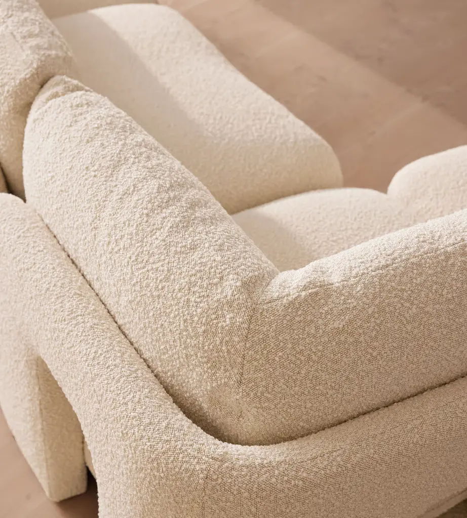 Designed to be configured to your living space with individual modules, now built with a deeper sit than the original. A new introduction to our original Odell sofa range, this modular design has a deeper sit for enhanced lounging. Fully upholstered in natural boucle and finished with feather-wrapped cushions, its low profile is characterized by a unique arched back with cut-out detailing to create a focal point from every angle.
