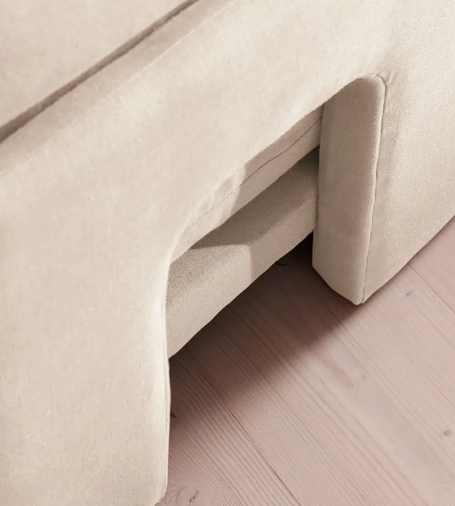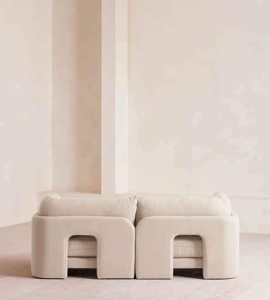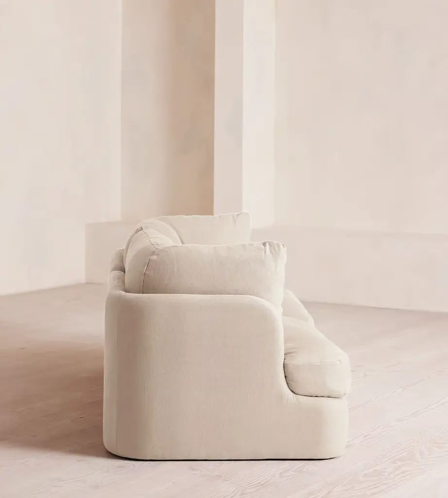 Designed to be configured to your living space with individual modules, now built with a deeper sit than the original. A new introduction to our original Odell sofa range, this modular design has a deeper sit for enhanced lounging. Fully upholstered in linen and finished with feather-wrapped cushions, its low profile is characterized by a unique arched back with cut-out detailing to create a focal point from every angle.