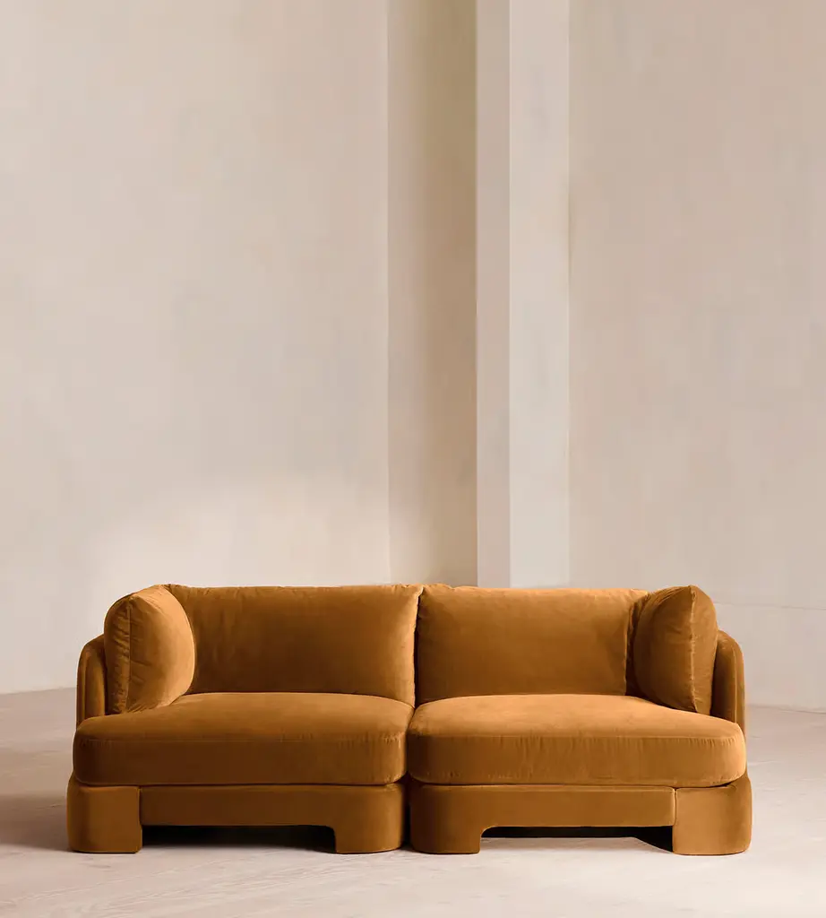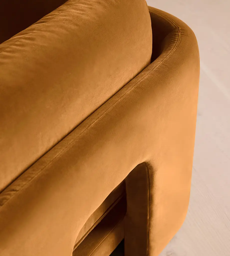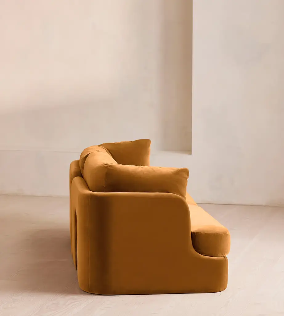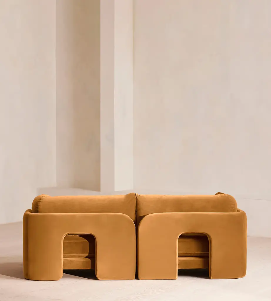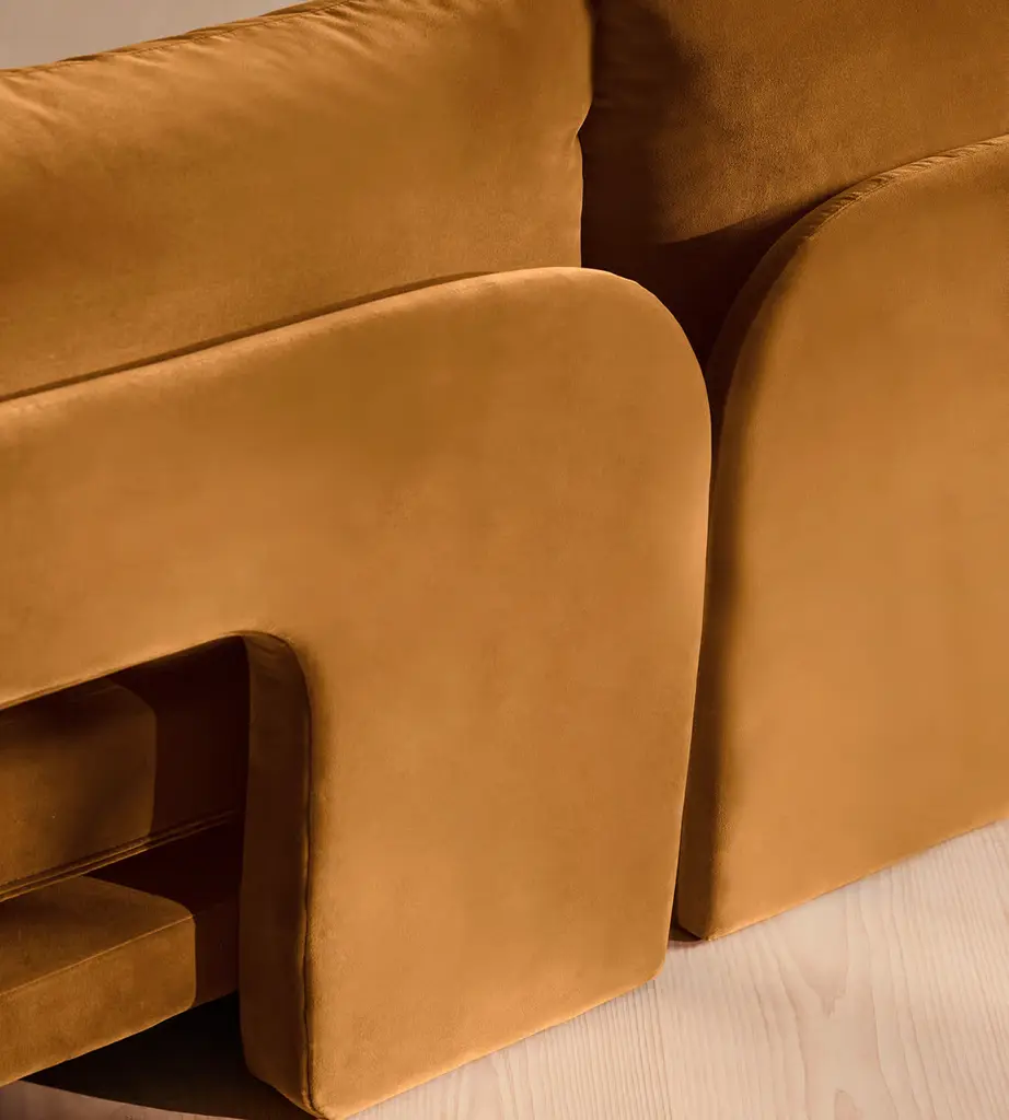 Designed to be configured to your living space with individual modules, now built with a deeper sit than the original. A new introduction to our original Odell sofa range, this modular design has a deeper sit for enhanced lounging. Fully upholstered in velvet and finished with feather-wrapped cushions, its low profile is characterized by a unique arched back with cut-out detailing to create a focal point from every angle.
