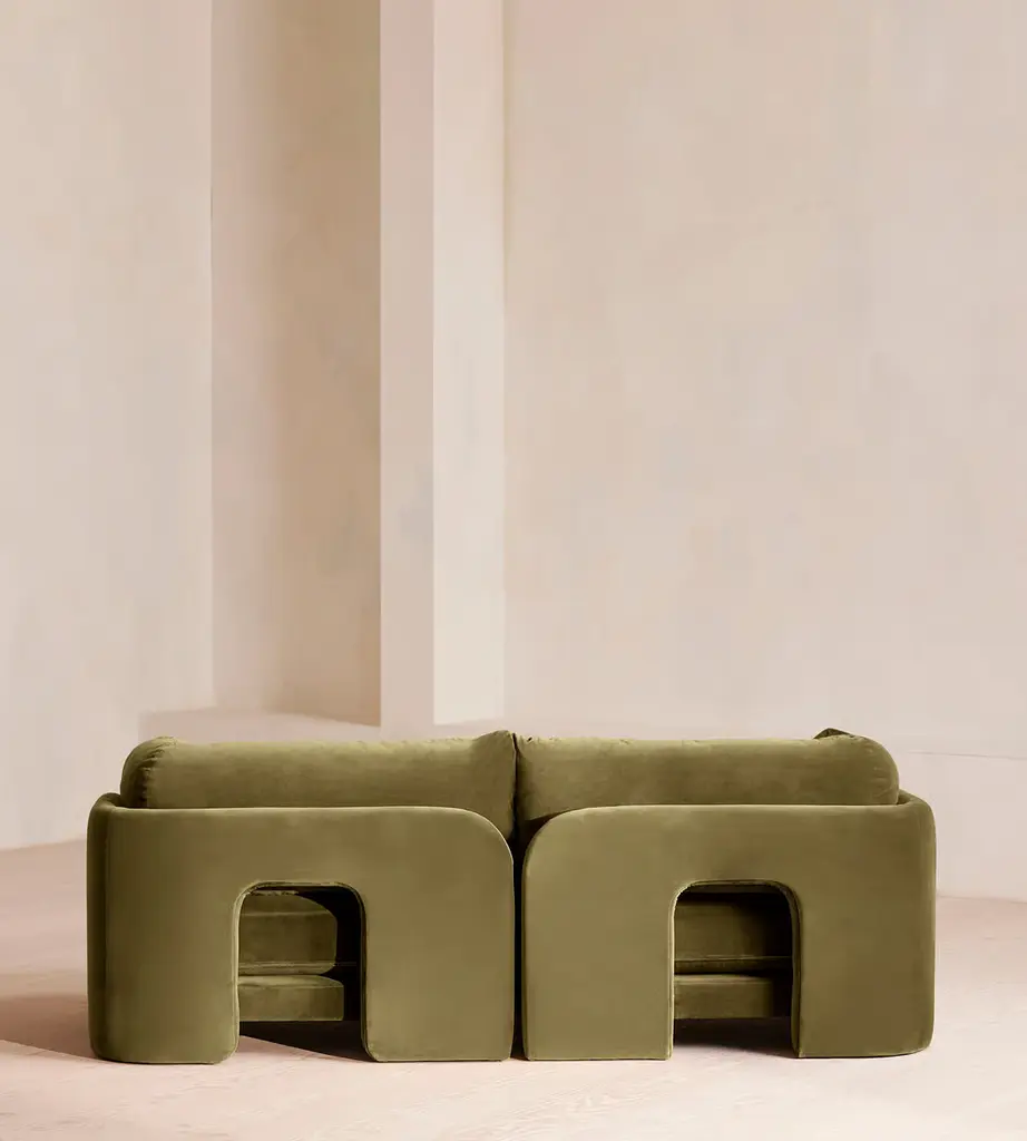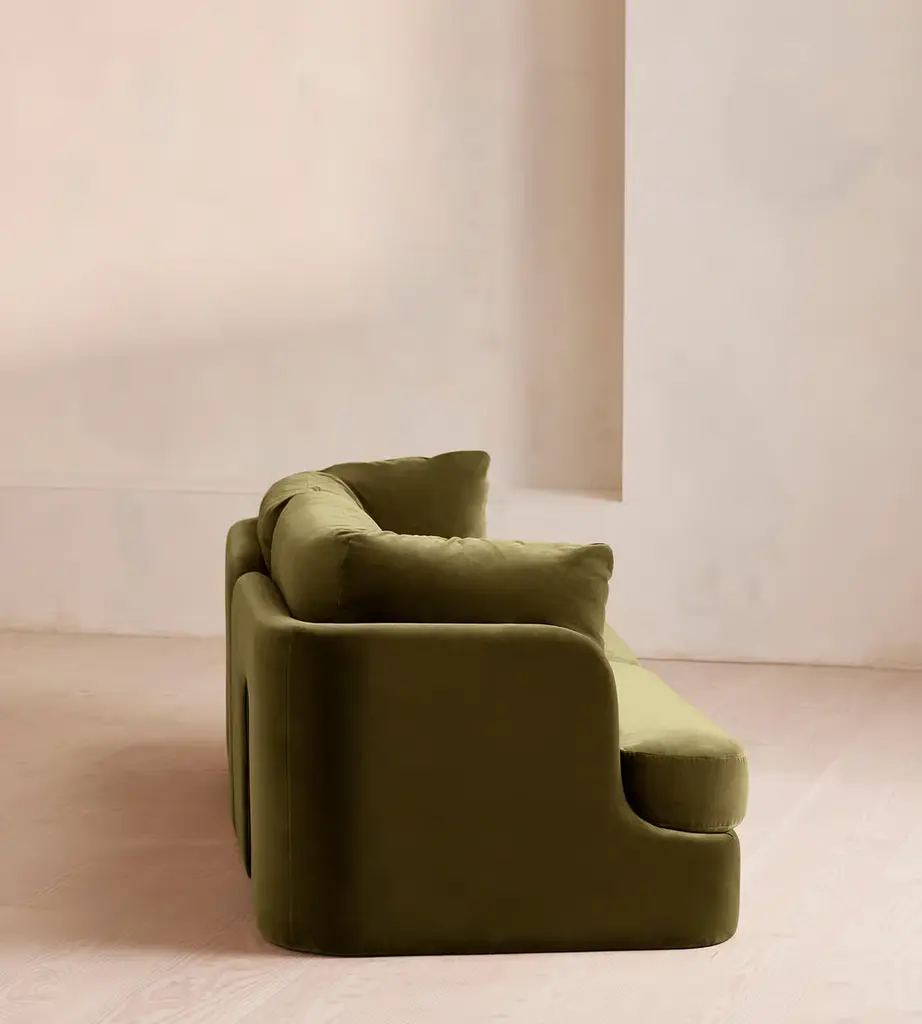 Designed to be configured to your living space with individual modules, now built with a deeper sit than the original. A new introduction to our original Odell sofa range, this modular design has a deeper sit for enhanced lounging. Fully upholstered in velvet and finished with feather-wrapped cushions, its low profile is characterized by a unique arched back with cut-out detailing to create a focal point from every angle.