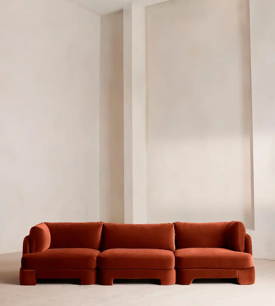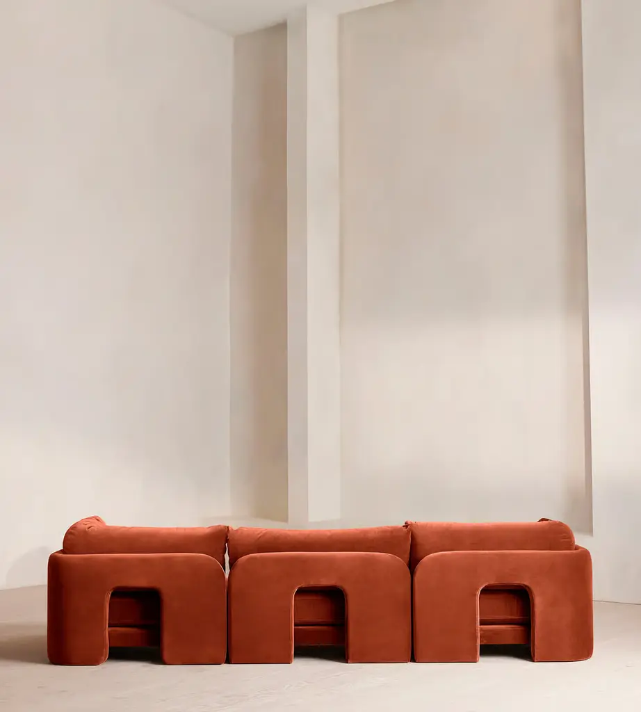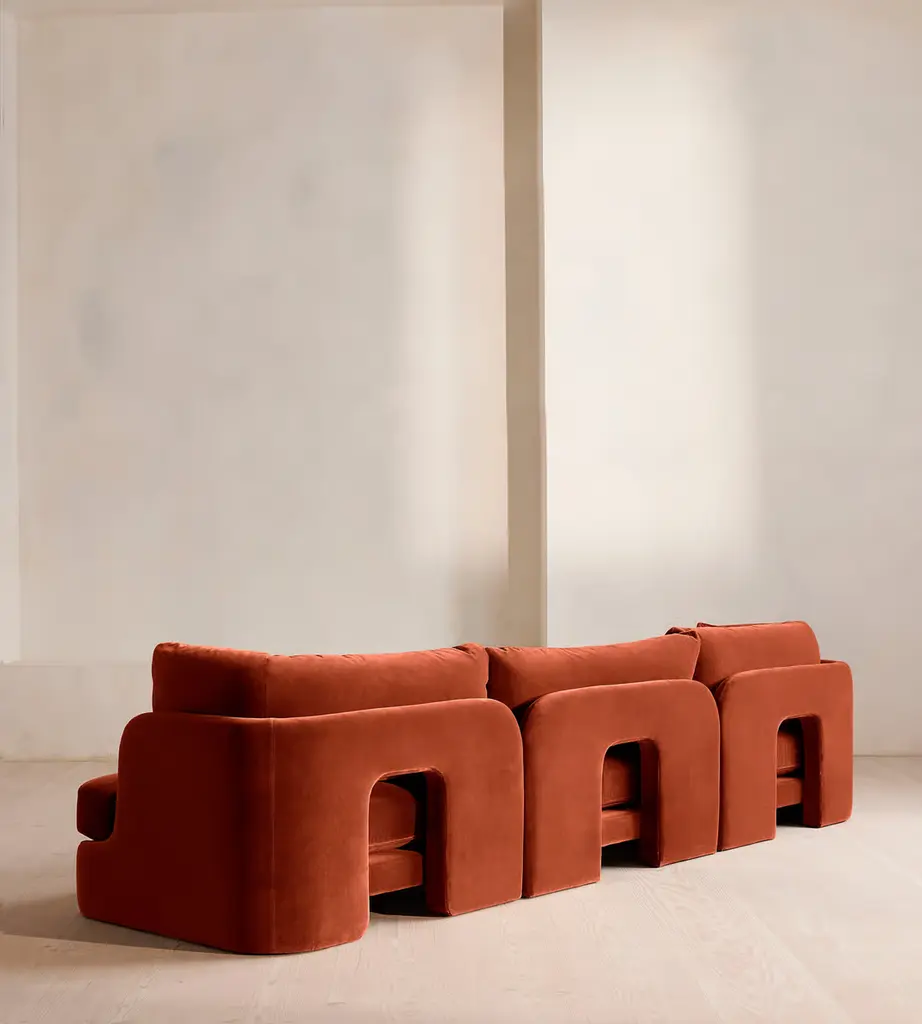 Designed to be configured to your living space with individual modules, now built with a deeper sit than the original. A new introduction to our original Odell sofa range, this modular design has a deeper sit for enhanced lounging. Fully upholstered in velvet and finished with feather-wrapped cushions, its low profile is characterized by a unique arched back with cut-out detailing to create a focal point from every angle.