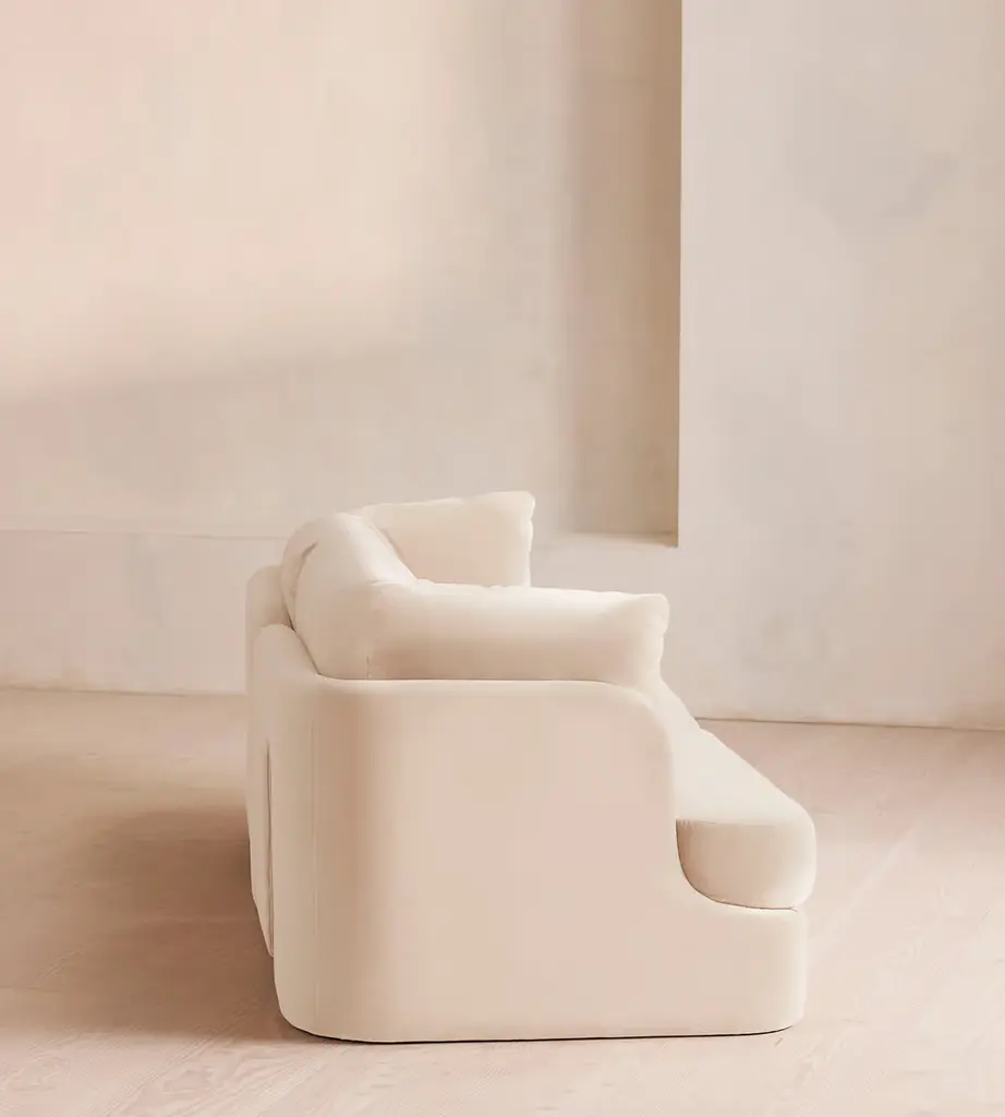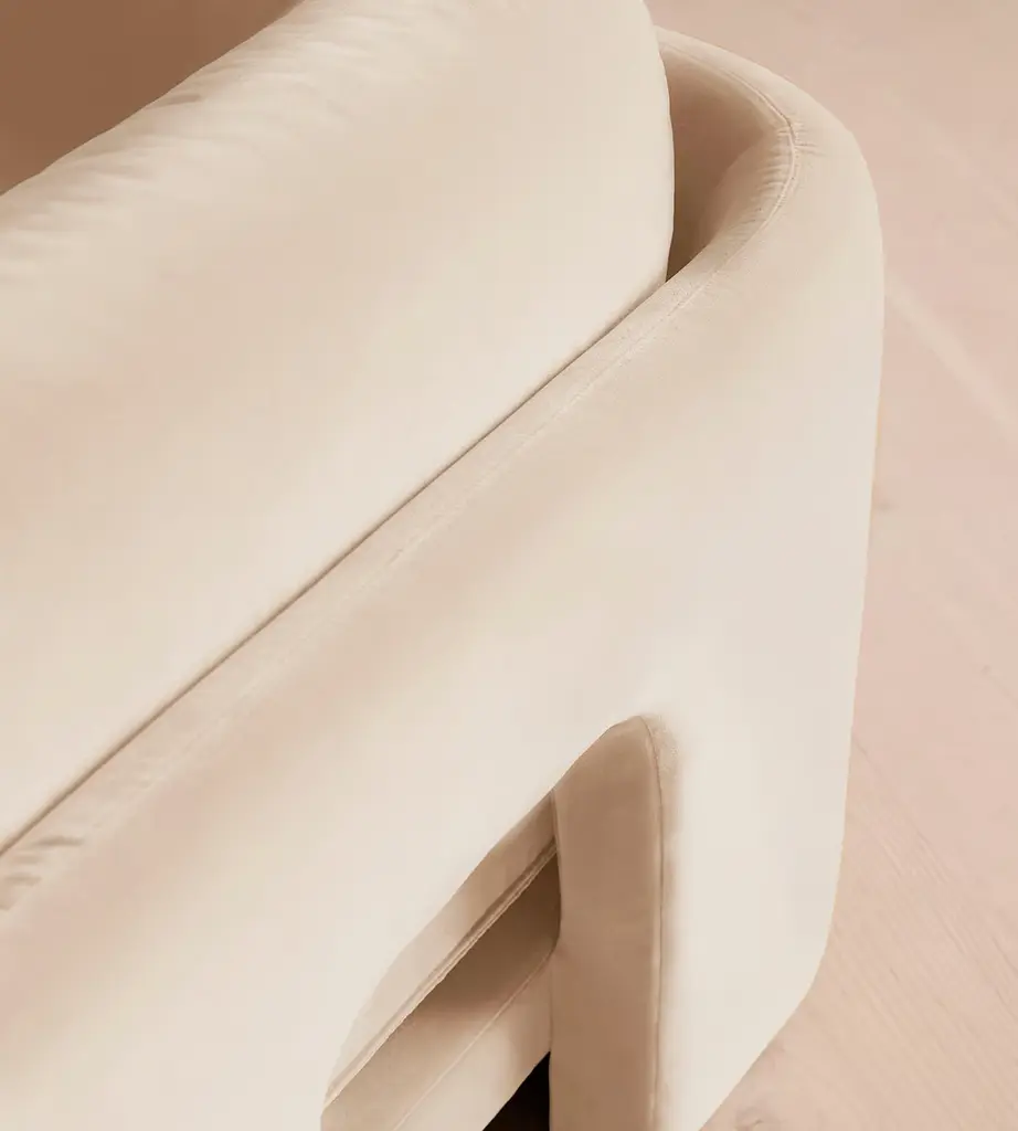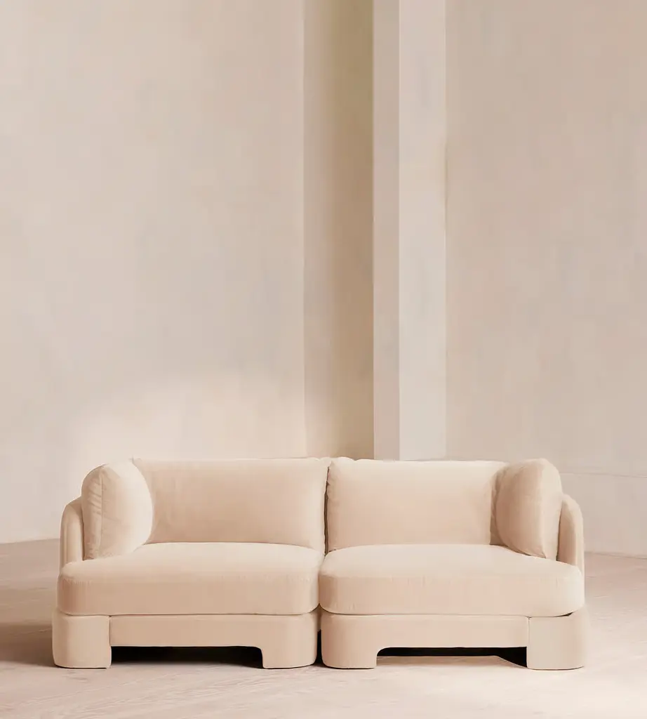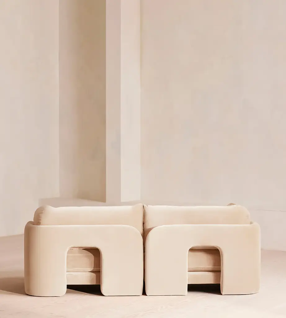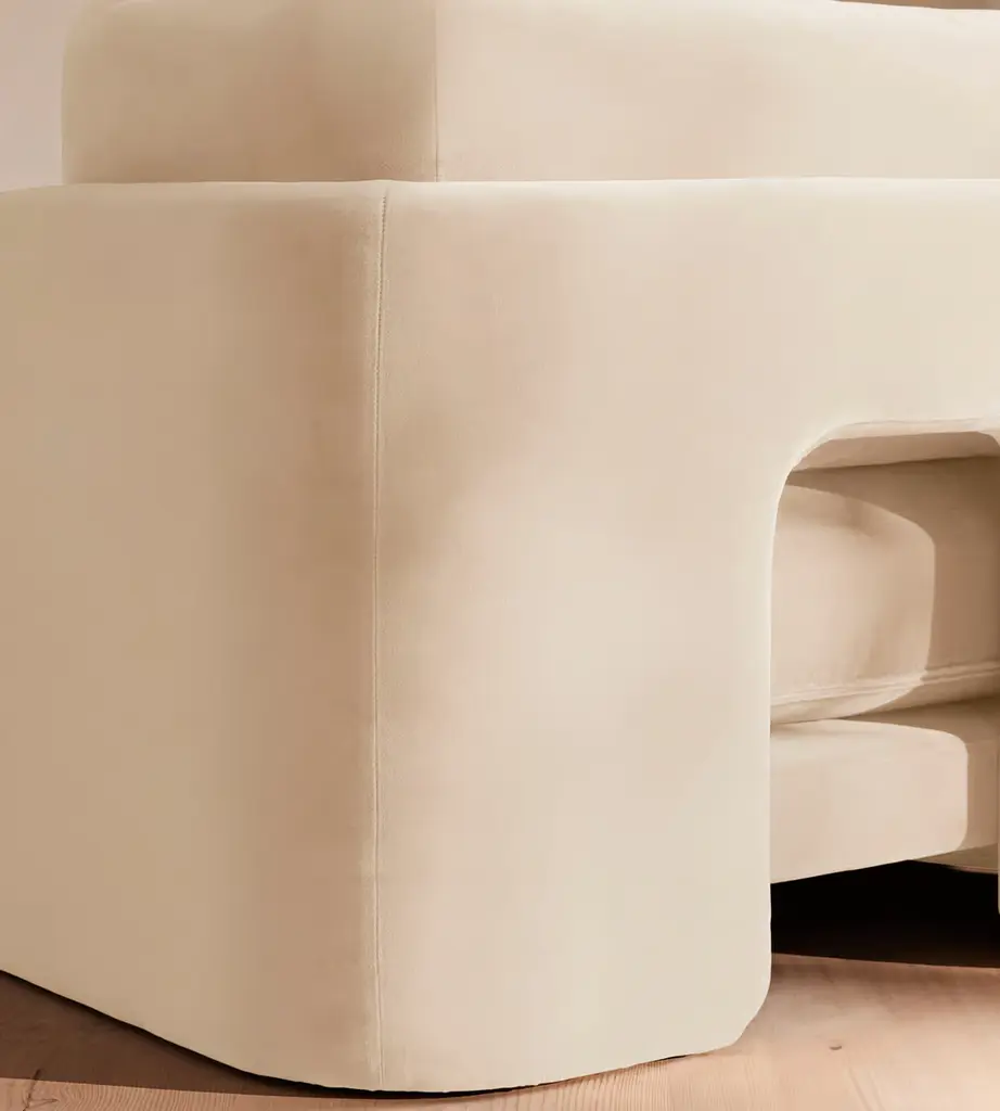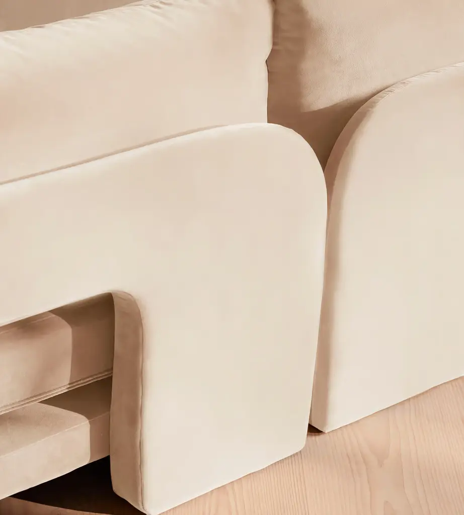 Designed to be configured to your living space with individual modules, now built with a deeper sit than the original. A new introduction to our original Odell sofa range, this modular design has a deeper sit for enhanced lounging. Fully upholstered in velvet and finished with feather-wrapped cushions, its low profile is characterized by a unique arched back with cut-out detailing to create a focal point from every angle.