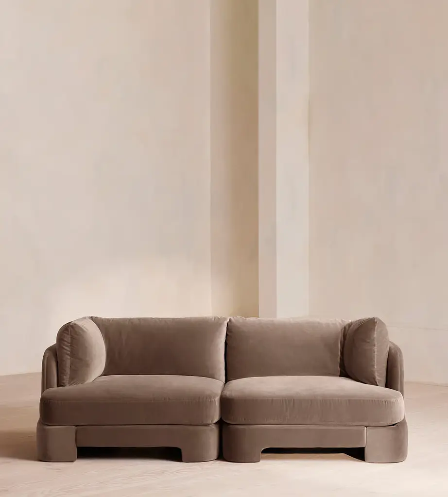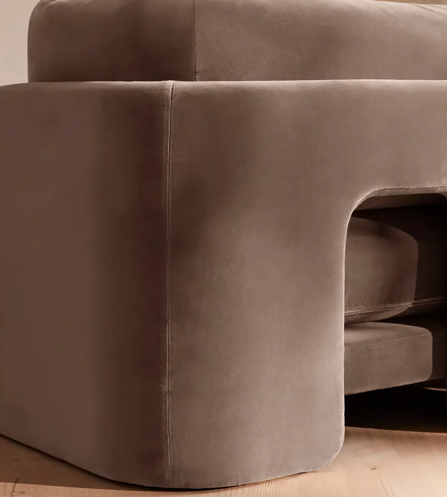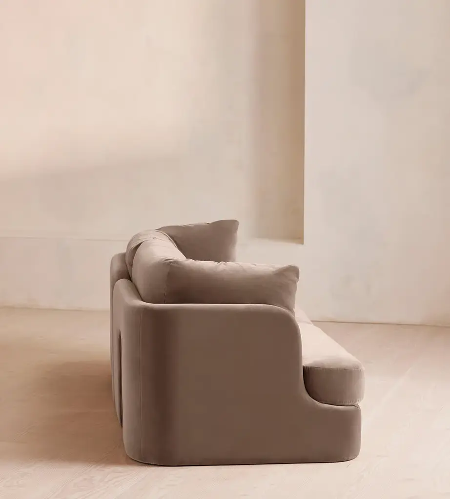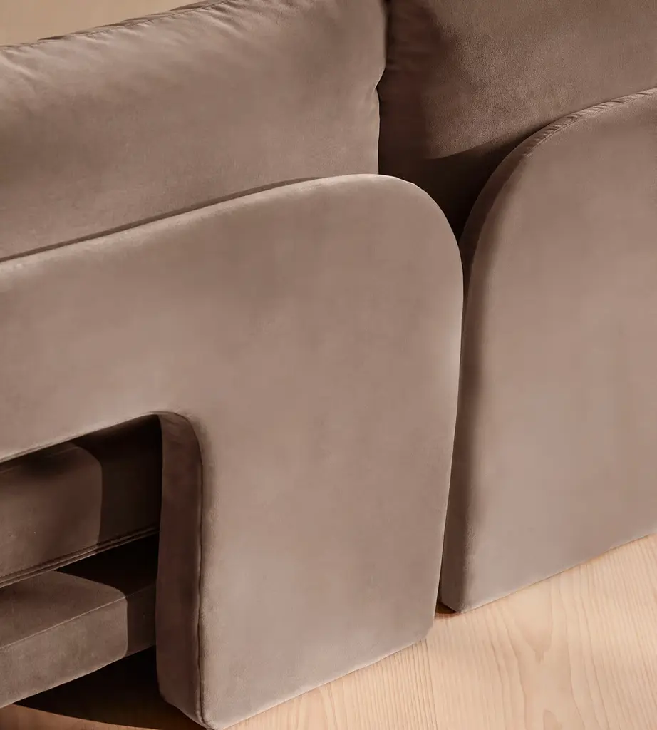 Designed to be configured to your living space with individual modules, now built with a deeper sit than the original. A new introduction to our original Odell sofa range, this modular design has a deeper sit for enhanced lounging. Fully upholstered in velvet and finished with feather-wrapped cushions, its low profile is characterized by a unique arched back with cut-out detailing to create a focal point from every angle.