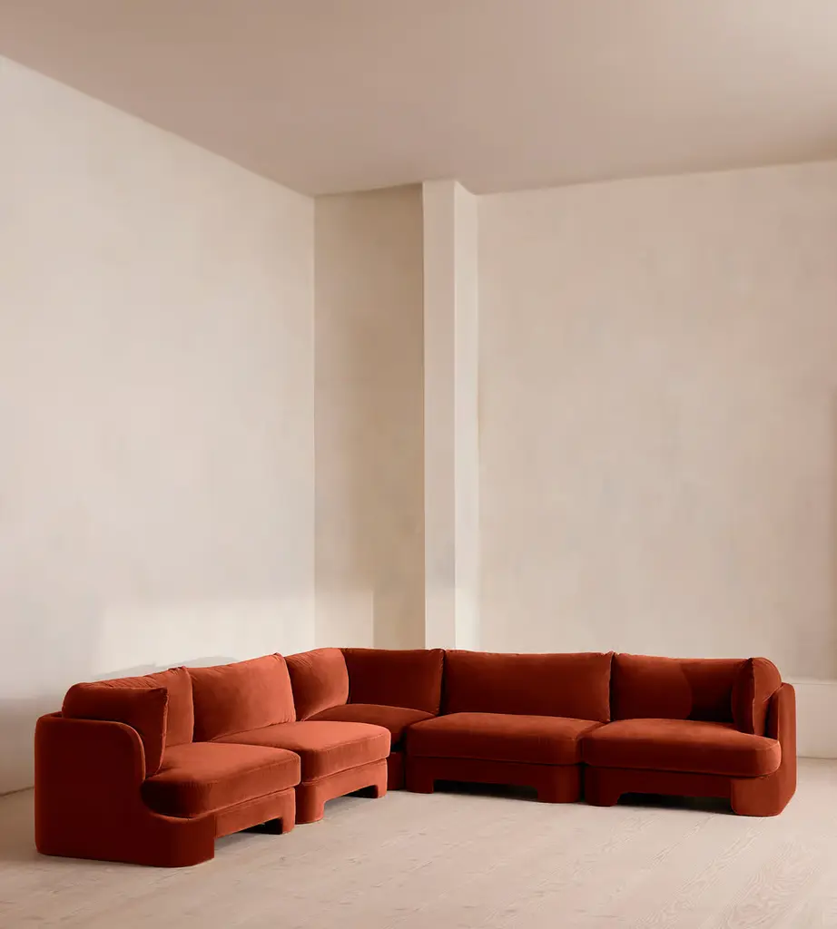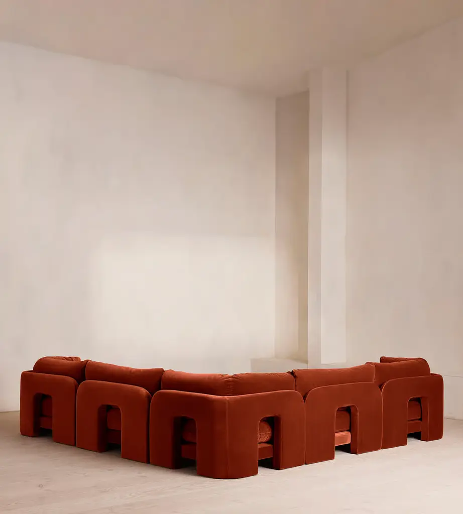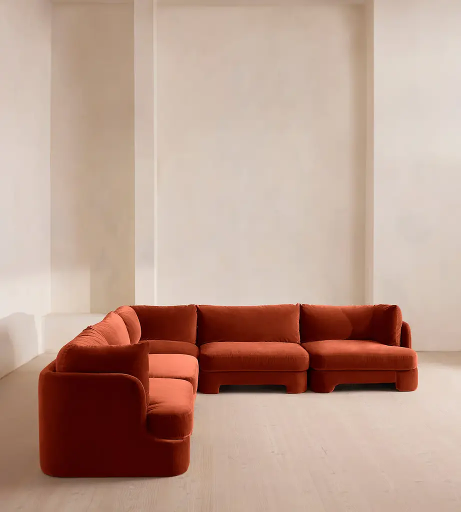 The unique Cut-out arch back and low profile of our Odell sectional sofa mirror the retro-inspired interiors of 180 House. Fully upholstered in rich velvet, this style allows you to configure the size and orientation to your individual living space with four modules, including a corner module for the more personal moments. Feather-wrapped foam cushions provide all-day comfort when a weekend of lounging calls.