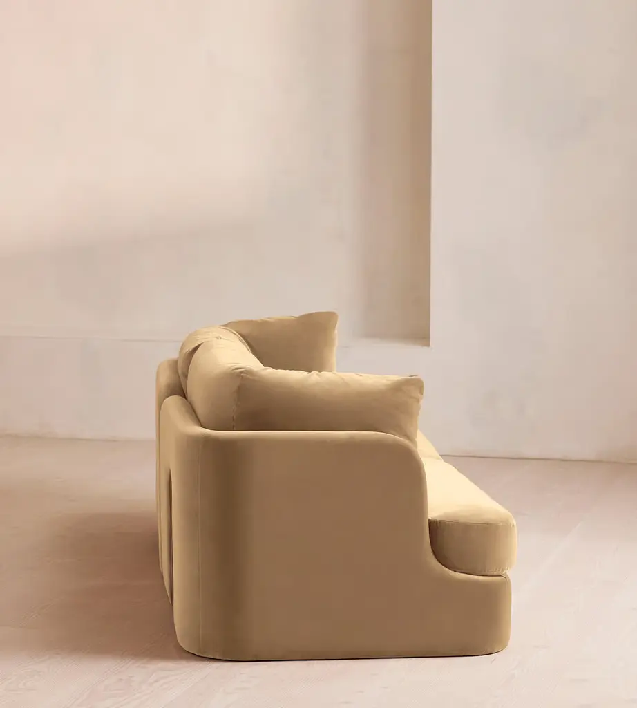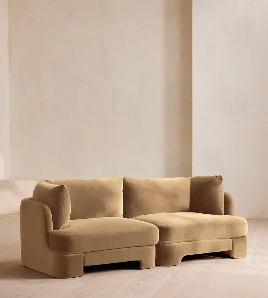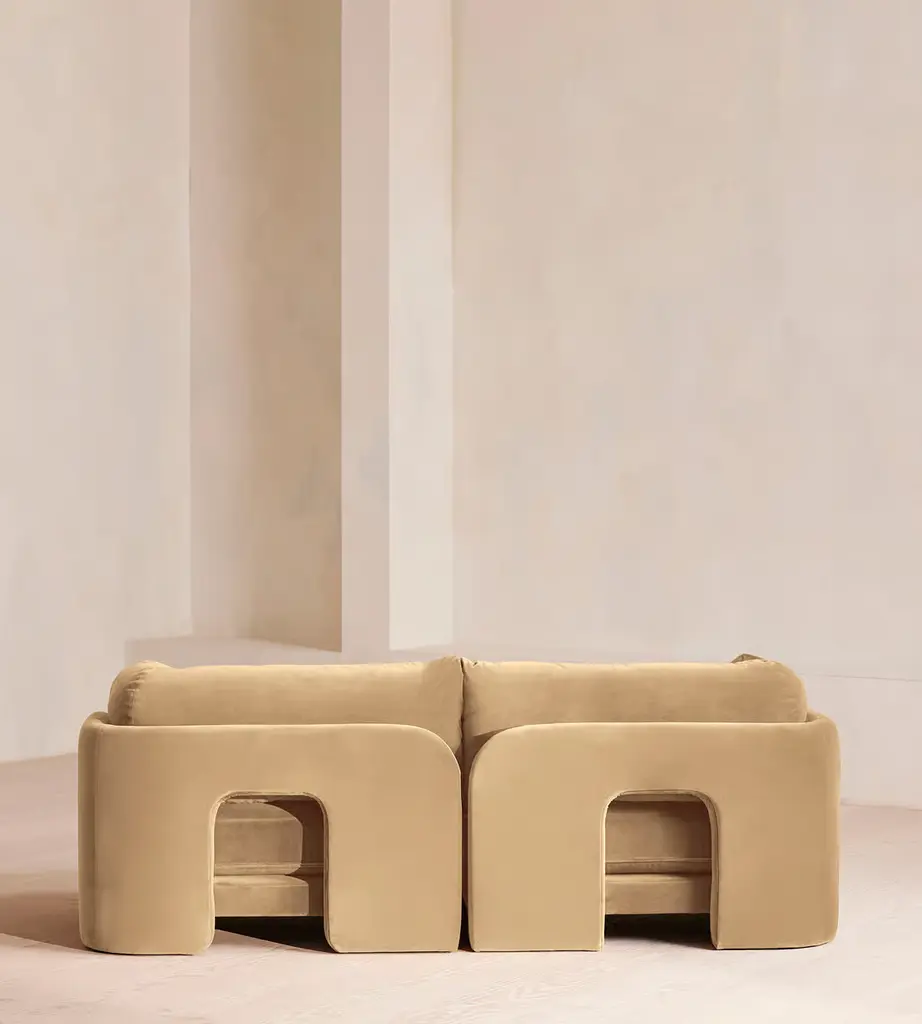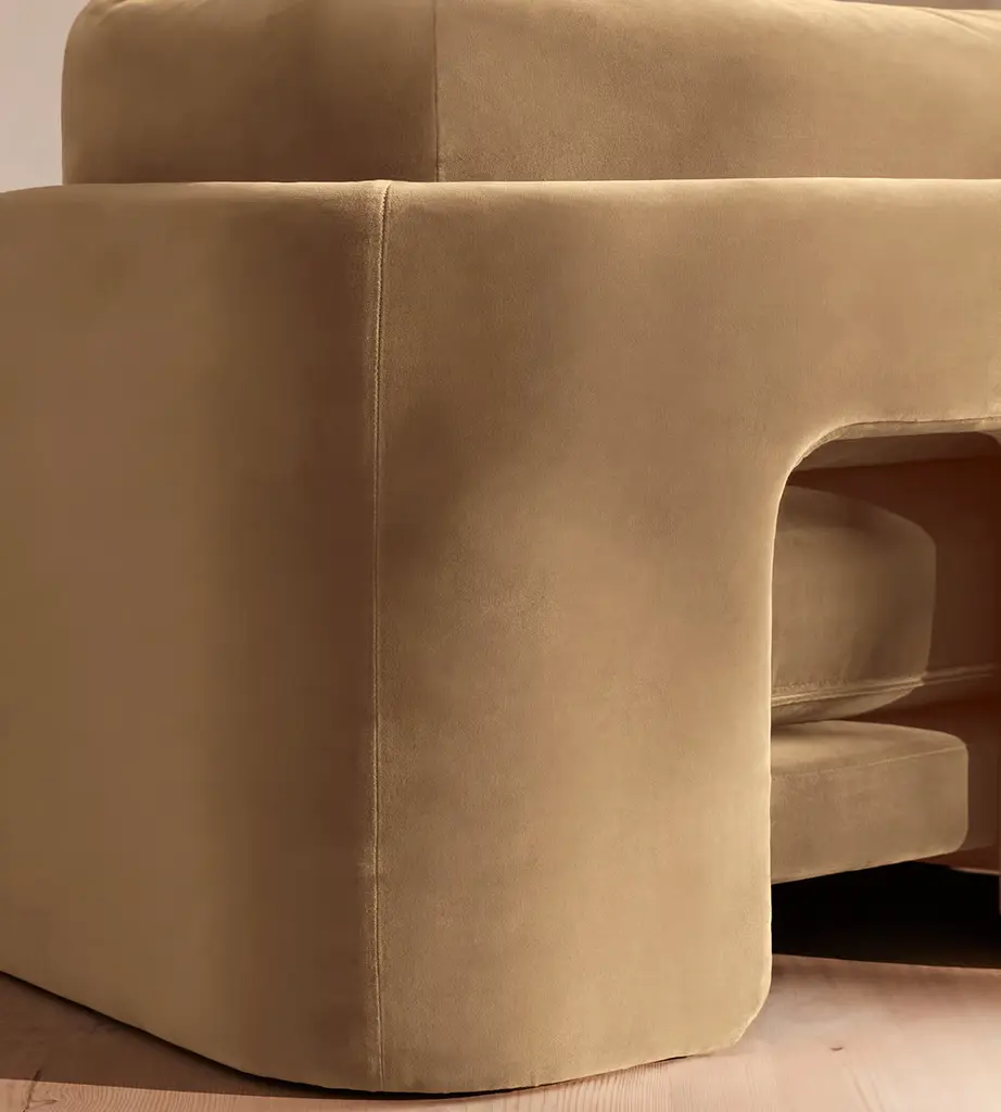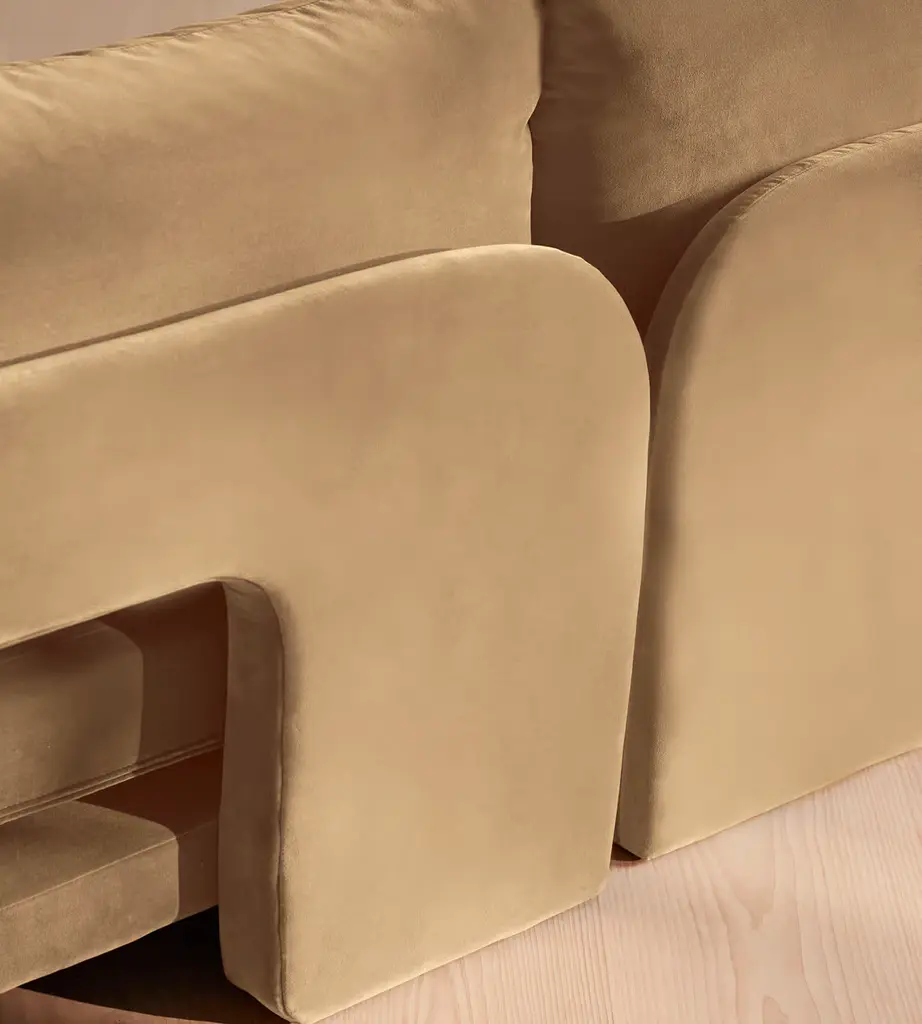 The unique Cut-out arch back and low profile of our Odell sectional sofa mirror the retro-inspired interiors of 180 House. Fully upholstered in rich velvet, this style allows you to configure the size and orientation to your individual living space with three modules. Feather-wrapped foam cushions provide all-day comfort when a weekend of lounging calls.