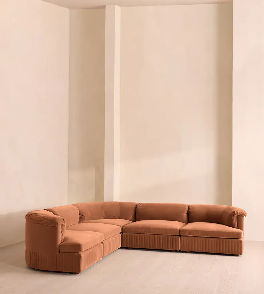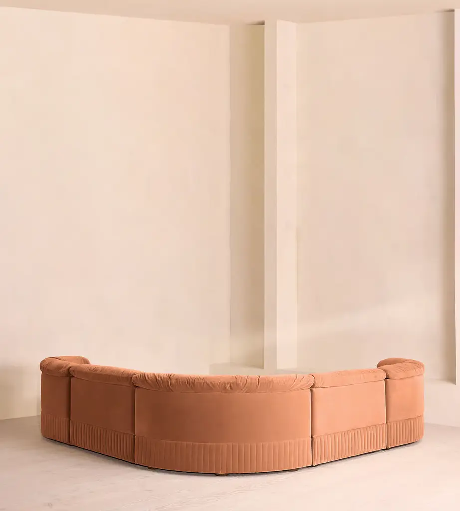 A generous, rounded silhouette is finished with feather-wrapped cushions in velvet upholstery. Designed to perfectly adapt to your space, our Oona sectional sofa is available as left or right arm and rounded corner sections, as well as a matching ottoman to create the ideal configuration for your living requirements. Comfortable feather-wrapped seat and back cushions are fully upholstered in velvet, complemented by channeled upholstery at the base.