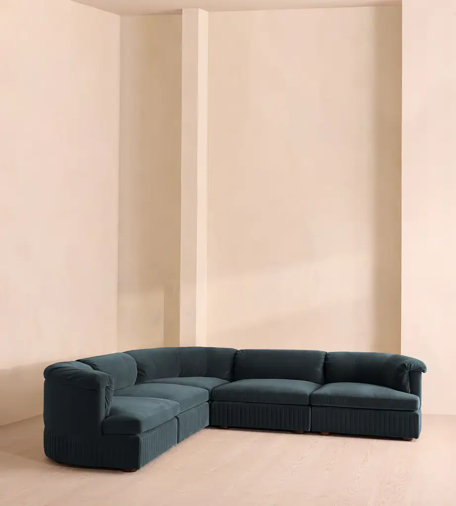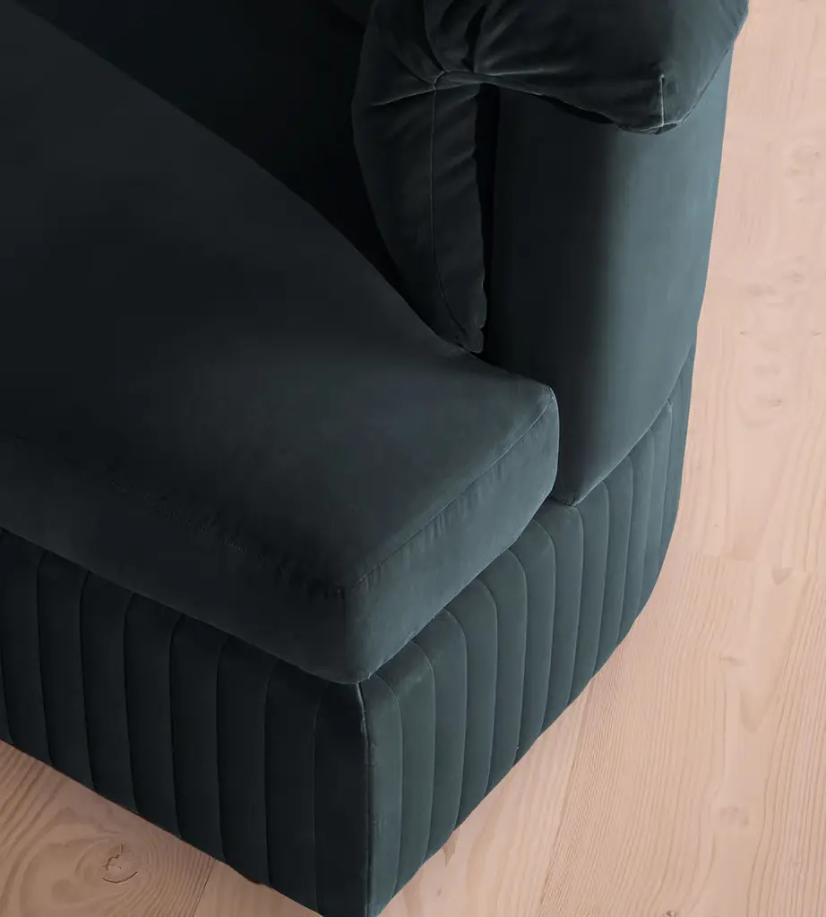 A generous, rounded silhouette is finished with feather-wrapped cushions in velvet upholstery. Designed to perfectly adapt to your space, our Oona sectional sofa is available as left or right arm and rounded corner sections, as well as a matching ottoman to create the ideal configuration for your living requirements. Comfortable feather-wrapped seat and back cushions are fully upholstered in velvet, complemented by channeled upholstery at the base.