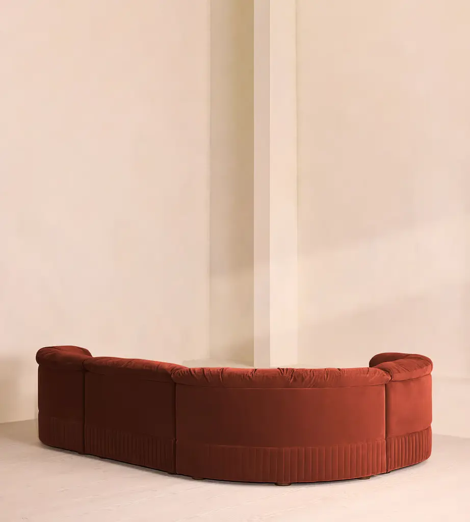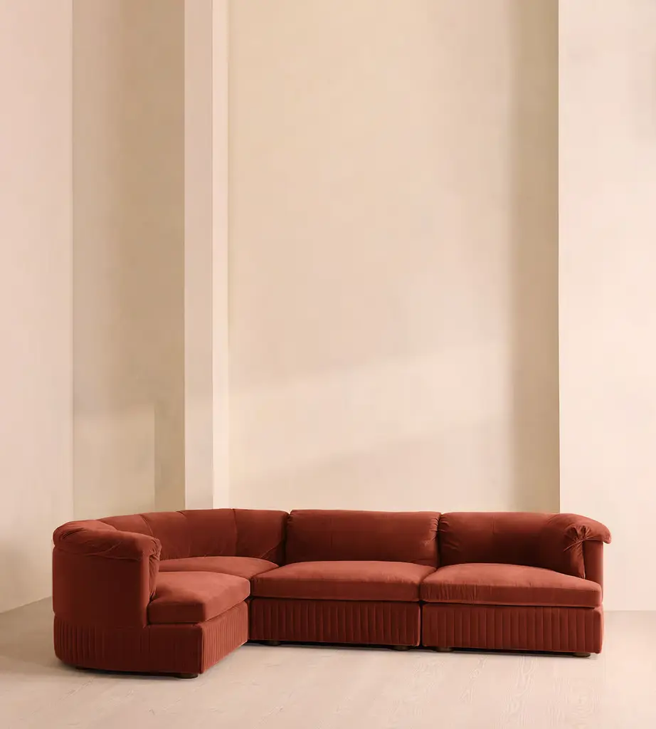 A generous, rounded silhouette is finished with feather-wrapped cushions in velvet upholstery. Designed to perfectly adapt to your space, our L-shaped Oona modular sofa is made to create the ideal configuration for your living requirements. Comfortable feather-wrapped seat and back cushions are fully upholstered in velvet, complemented by channeled upholstery at the base.