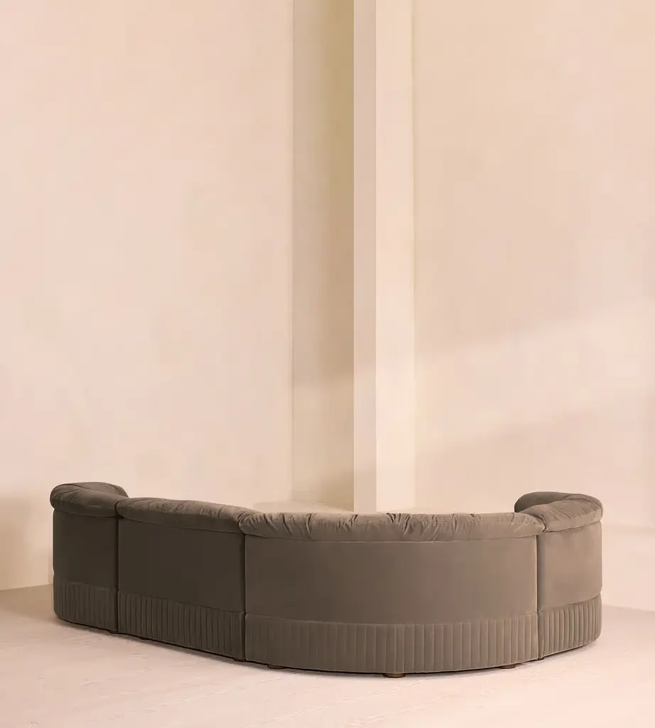 A generous, rounded silhouette is finished with feather-wrapped cushions in velvet upholstery. Designed to perfectly adapt to your space, our L-shaped Oona modular sofa is made to create the ideal configuration for your living requirements. Comfortable feather-wrapped seat and back cushions are fully upholstered in velvet, complemented by channeled upholstery at the base.