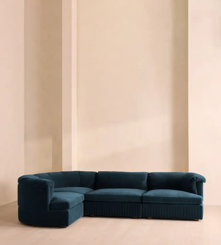 A generous, rounded silhouette is finished with feather-wrapped cushions in velvet upholstery. Designed to perfectly adapt to your space, our L-shaped Oona modular sofa is made to create the ideal configuration for your living requirements. Comfortable feather-wrapped seat and back cushions are fully upholstered in velvet, complemented by channeled upholstery at the base.