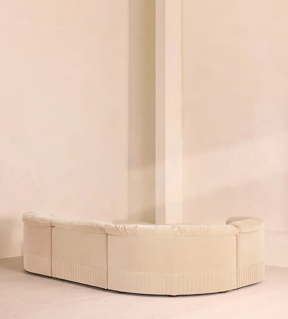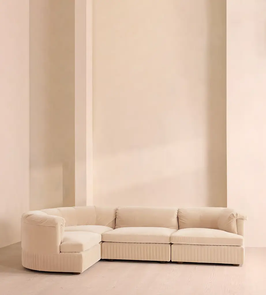A generous, rounded silhouette is finished with feather-wrapped cushions in velvet upholstery. Designed to perfectly adapt to your space, our L-shaped Oona modular sofa is made to create the ideal configuration for your living requirements. Comfortable feather-wrapped seat and back cushions are fully upholstered in velvet, complemented by channeled upholstery at the base.