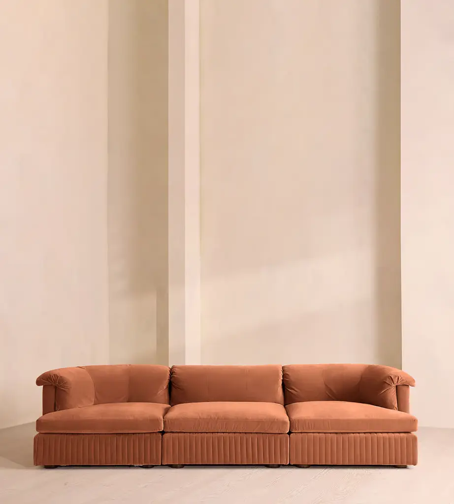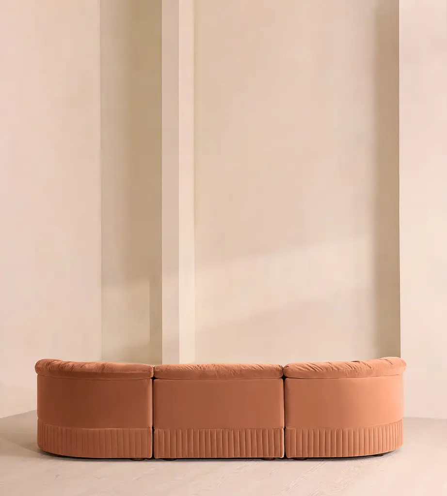 A generous, rounded silhouette is finished with feather-wrapped cushions in velvet upholstery. Designed to perfectly adapt to your space, our Oona four-seater modular sofa is made to create the ideal configuration for your living requirements. Comfortable feather-wrapped seat and back cushions are fully upholstered in velvet, complemented by channeled upholstery at the base.