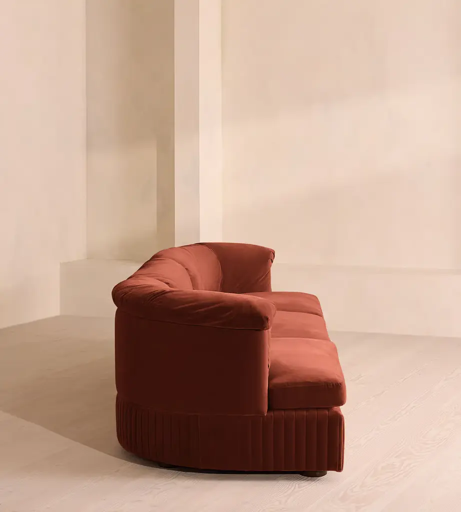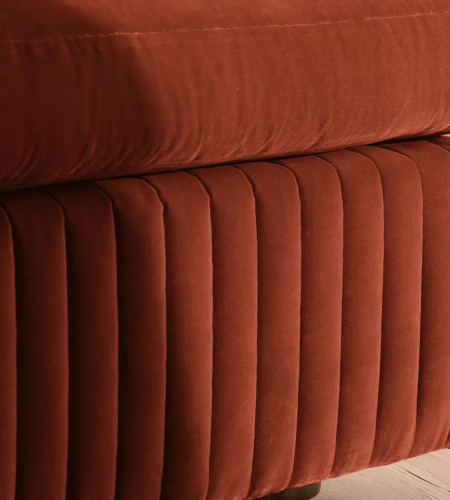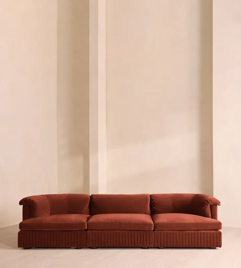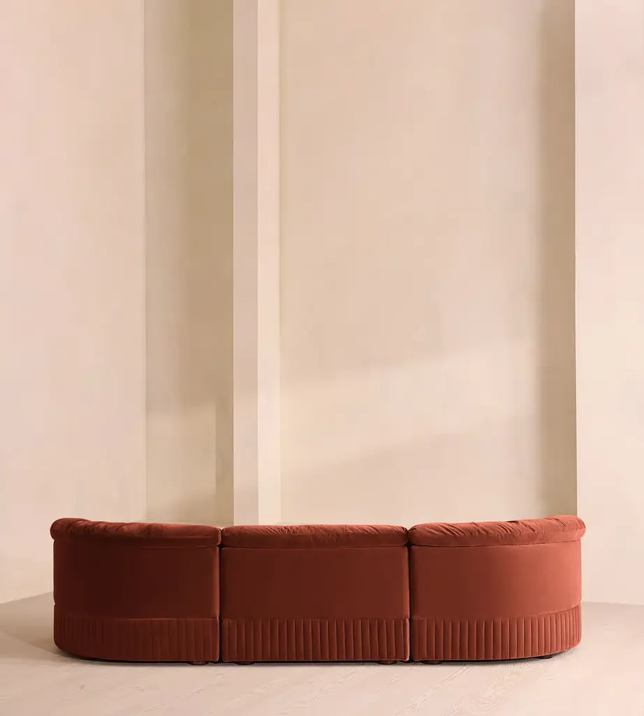 A generous, rounded silhouette is finished with feather-wrapped cushions in velvet upholstery. Designed to perfectly adapt to your space, our Oona four-seater modular sofa is made to create the ideal configuration for your living requirements. Comfortable feather-wrapped seat and back cushions are fully upholstered in velvet, complemented by channeled upholstery at the base.