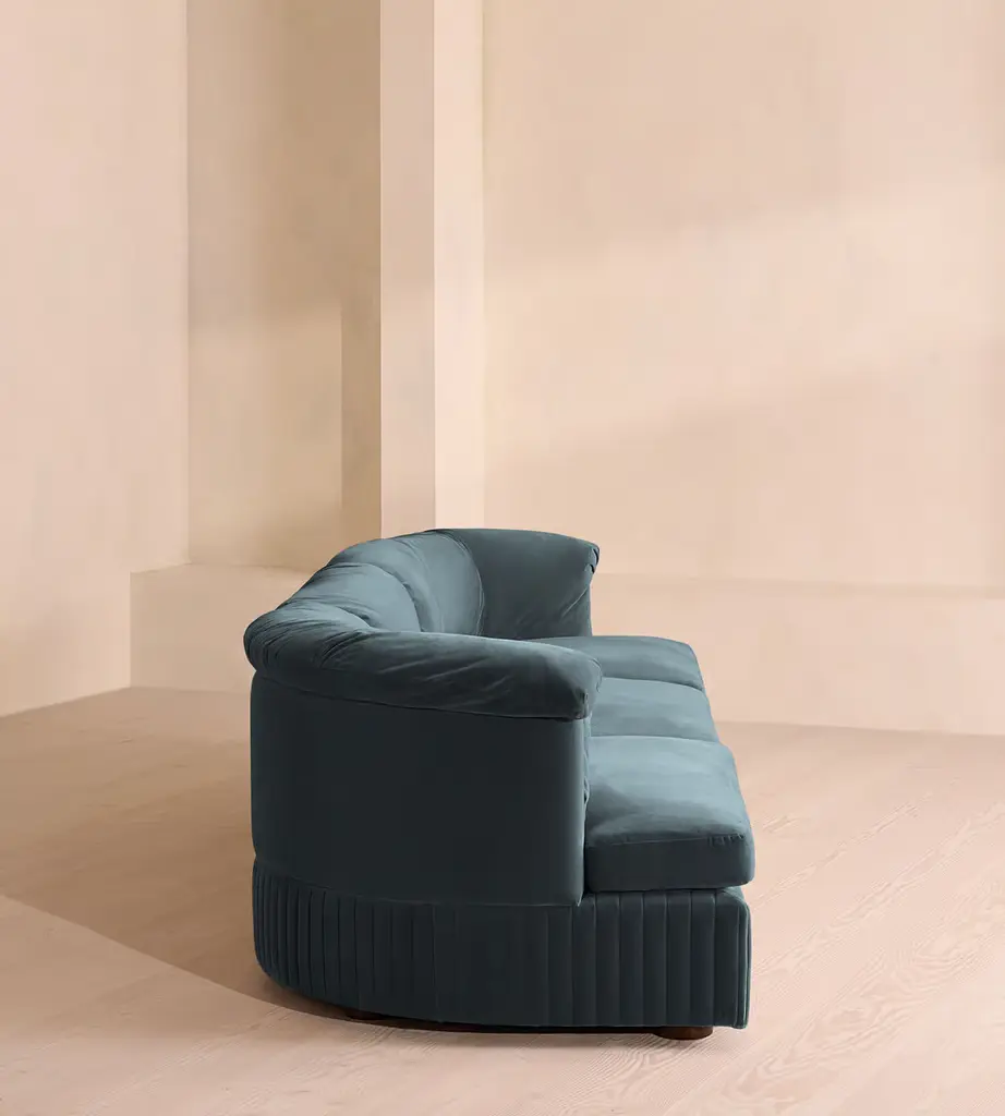 A generous, rounded silhouette is finished with feather-wrapped cushions in velvet upholstery. Designed to perfectly adapt to your space, our Oona four-seater modular sofa is made to create the ideal configuration for your living requirements. Comfortable feather-wrapped seat and back cushions are fully upholstered in velvet, complemented by channeled upholstery at the base.