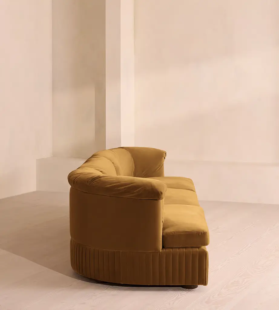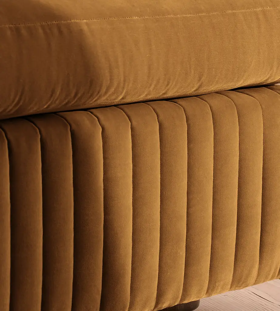 A generous, rounded silhouette is finished with feather-wrapped cushions in velvet upholstery. Designed to perfectly adapt to your space, our Oona four-seater modular sofa is made to create the ideal configuration for your living requirements. Comfortable feather-wrapped seat and back cushions are fully upholstered in velvet, complemented by channeled upholstery at the base.