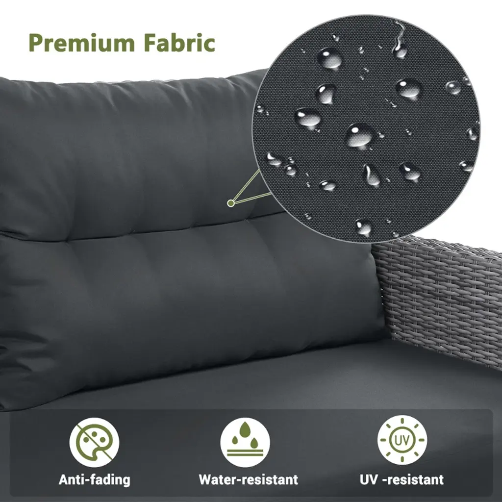 Ultimate Comfort & Versatility — Outdoor Reclining Sofa Set with Ottomans & Adjustable Table Transform your backyard, patio, or garden into a personalized oasis with this multifunctional Outdoor Recliner Furniture Set. Designed for flexibility and luxury, this set features reclining seats, movable ottomans, and a dual-height table—perfect for everything from relaxing to entertaining. Product Features Recliners with Side Tables: Two side recliners adjust easily from 90° to 150°, letting you customize your lounging angle. Built-in side tables keep your drinks, snacks, and books within reach for a truly relaxing experience.Adjustable Height Table: This stylish table can switch between two height settings, adapting effortlessly for dining, working, or casual lounging. Topped with tempered glass for durability, scratch resistance, and easy cleaning.Movable Ottomans: Comes with two ottomans that can be used as footrests, extra seating, or even side tables. Their modular design gives you complete freedom to rearrange your space as needed.Premium Weather-Resistant Materials: Built to last with rust-resistant iron frames and woven PE rattan that stands up to rain and sun. The beige cushions feature UV- and water-resistant polyester fabric with removable, machine-washable covers.Sturdy Construction: Engineered for the outdoors, each seating piece supports up to 400 lbs and the table up to 200 lbs, ensuring both style and stability for years of enjoyment. Product Dimensions Sectional Sofa: 82.3"D x 82.3"W x 34.3"HOttoman: 19.8"D x 19.8"W x 18.2"HHigh Table: 55"D x 28.5"W x 21.7"HLow Table: 55"D x 28.5"W x 28.3"HCushion Thickness: 4 inches Weight & Capacity Total Weight: 212.1 lbsWeight Capacity: Sectional Sofa: 400 lbs/seat, Ottoman: 400 lbs/seat, Table: 200 lbs Materials & Construction Upholstery Material: Polyester (UV- and water-resistant)Frame: Iron + PE RattanSeat Construction: High-Density Foam (1.3 lbs/cu.ft)Leg Material: PlasticRemovable Backrest: YesRemovable Cushion & Cover: YesPillows Included: No Care Instructions Clean with tepid water and mild detergent using a soft brush.Dry thoroughly after cleaning to prevent moisture retention. Assembly Tips Insert screws loosely at first to ensure alignment before tightening.Do not over-tighten screws to prevent damage to the frame. Note: Product measurements are manual and may include slight deviations. Images are of actual samples; colors may appear slightly different due to lighting or monitor settings. This modular outdoor furniture set combines premium materials, thoughtful design, and multi-functional convenience—perfect for hosting, lounging, or simply enjoying your own backyard escape.