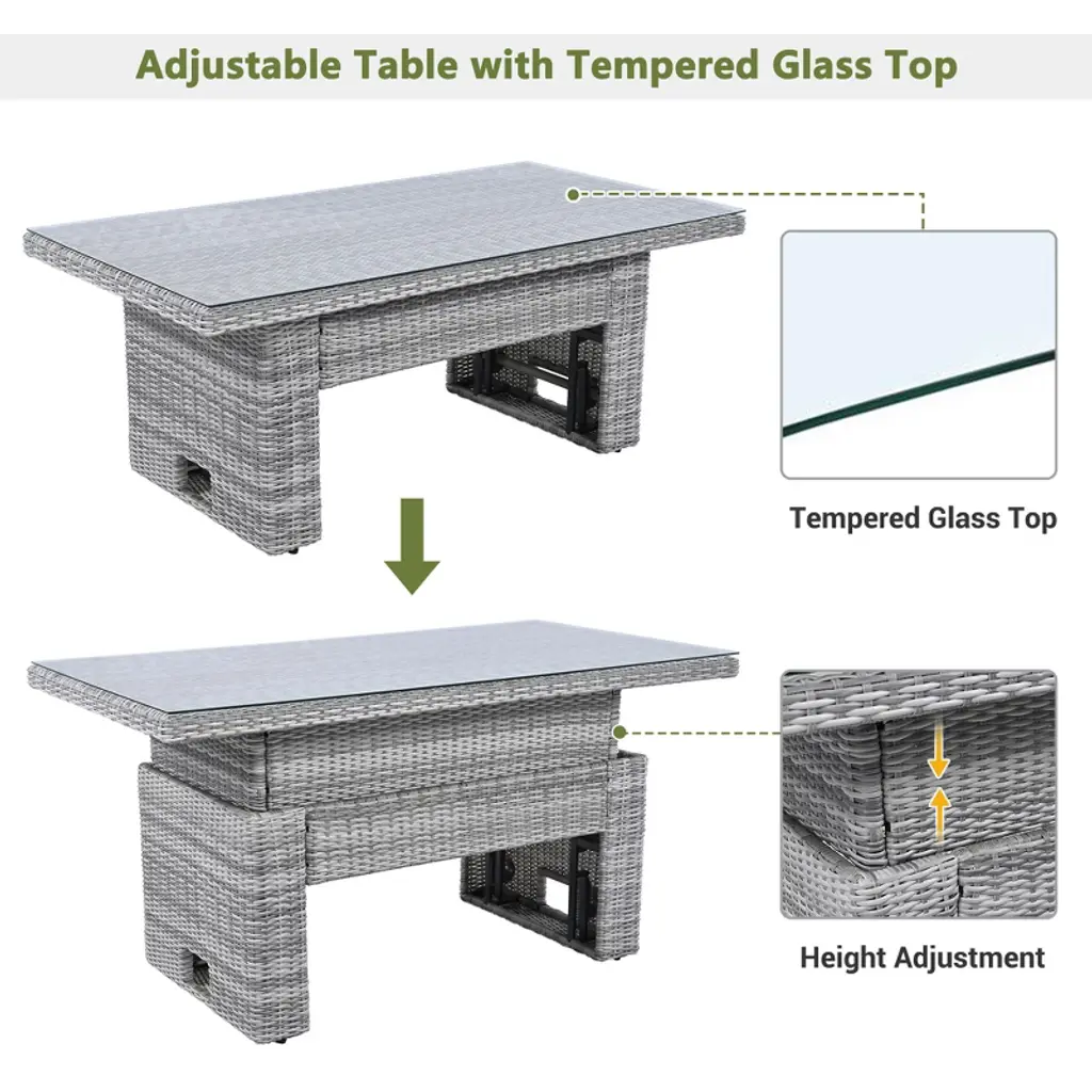 Outdoor Patio Rattan Sectional Sofa Set With Adjustable Height Table And 2 Reclining Seat, Extendable Side Tables