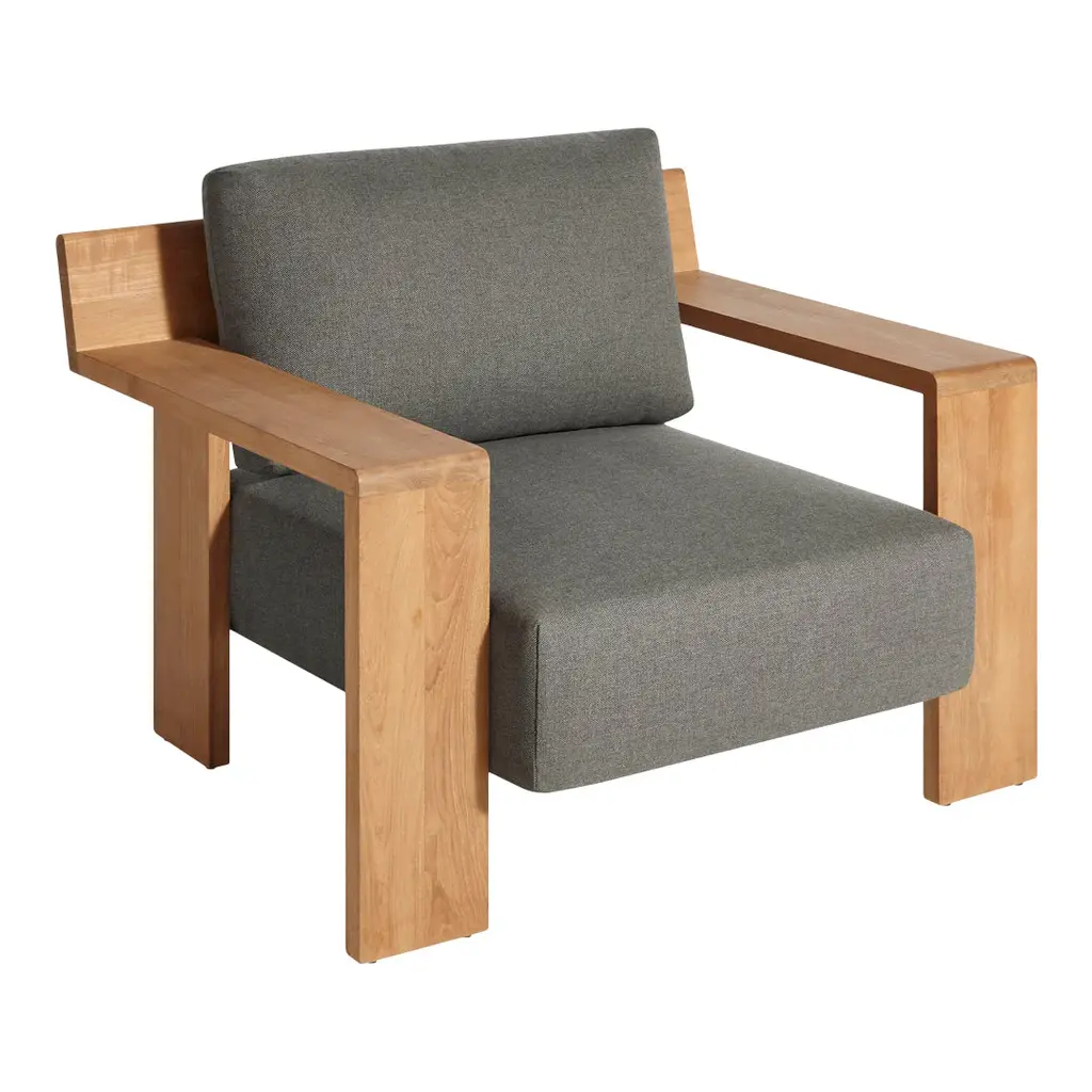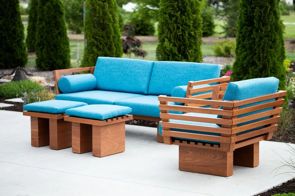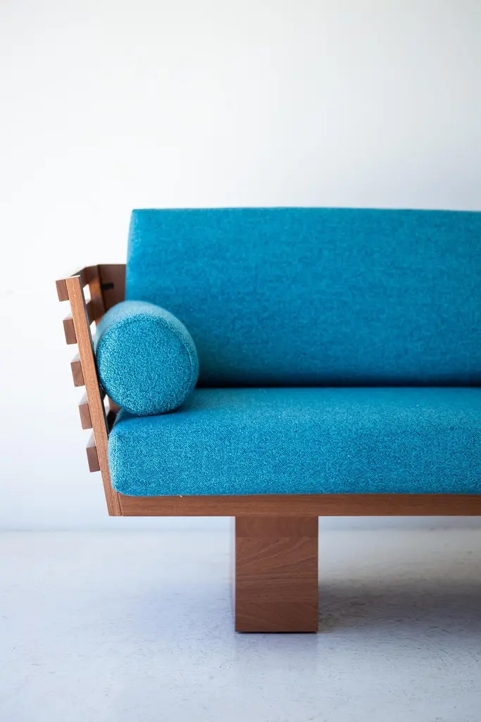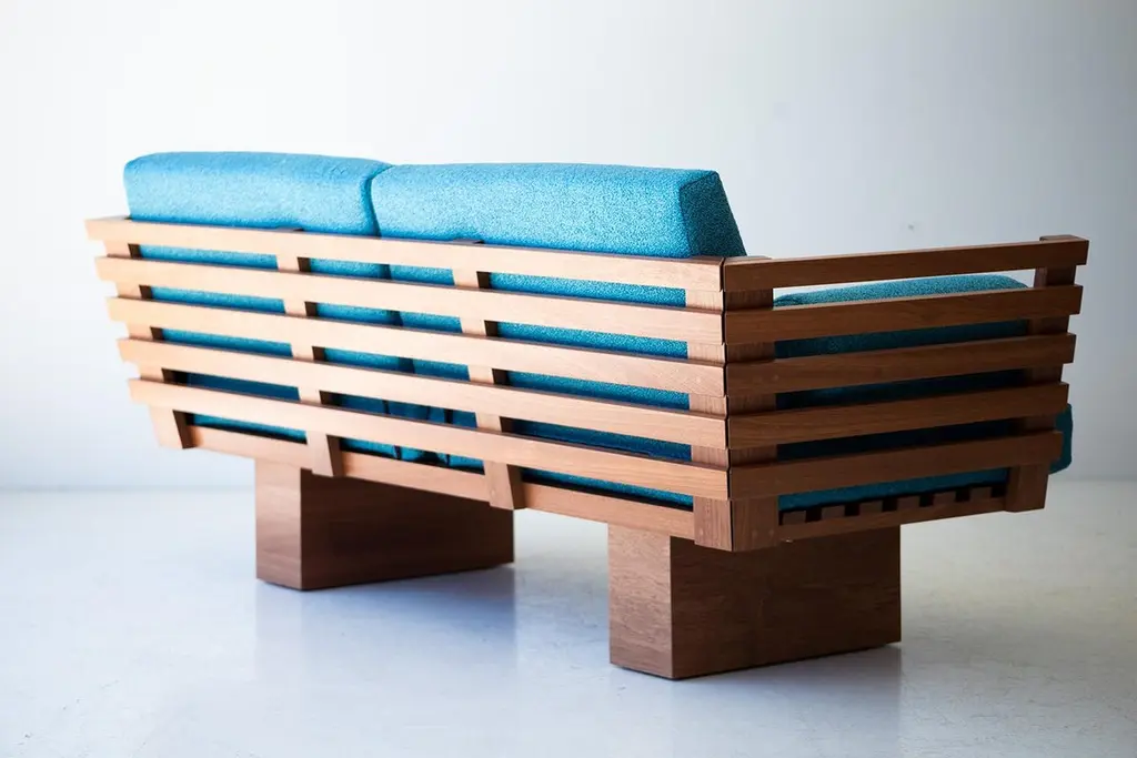 This Modern Patio Furniture - Suelo® Slatted Loveseat is beautifully constructed in Ohio, USA. This silhouette is simple, modern, and sleek with comfortable back and seat cushions. The wood frame is suitable for outdoor conditions and finished with a commercial grade exterior finish. Finish options include natural, grey-wash, dark walnut, and ebony. The cushions are upholstered with a fast dry foam and mesh bottom for longevity in outdoor use. 2 bolster pillows are perfectly placed in each arm. The Suelo® Collection consists of an arm chair, side chair, bench, daybed, loveseat, ottoman, dining chairs - both arm and side, and multiple orientations of sofas/sectionals for indoor or outdoor use. You can get any Suelo® piece in a solid or slatted version. This specific wood species is for outdoor use; other Suelo® listings show our indoor options. Performance outdoor fabric is included in the price. Many colors and textures available! Contact us for colors and samples. COM is always an option.Designer Inspiration: "The Suelo® Collection was inspired by my love for travel. So many places that inspire me have very minimal furniture, often built-in sofas with big comfy cushions, hammocks, raw natural wood, etc. The feel is low-key, simple, and comfortable. The wood isn't refined, it just IS. Functionality always plays into my designs as well, represented here by lower seating for a more intimate talking or lounging environment, and the platform wood extension detail on the sofa, which makes a great little table for your drink or cell phone. I envision this furniture used for indoor/outdoor spaces or any room that needs some comfort or relief. The Suelo® line reminds me of your own getaway - it has a natural, cool vibe and doesn't take itself too seriously. I imagine the sofa loaded up with pillows and some music playing in the background, of course." -Gretta Jones specsPeriod/Model: New; ModernSpecs: Mahogany, Natural Commercial Grade Exterior FinishCustomizable: Yes! It's what we do :) careOur furniture is solid wood, not veneer, and it requires special care. Please care for it! We recommend outdoor covers when pieces are not being used, especially in extreme weather. Outdoor covers are available through Bertu Home. Customer is responsible for normal care of this product.dimensionsH: 31.5" W: 72" D: 31"Seat H: 17"Seat W: 28.5" Seat D: 21" with back cushion, 27" withoutArm Height: 25.5".