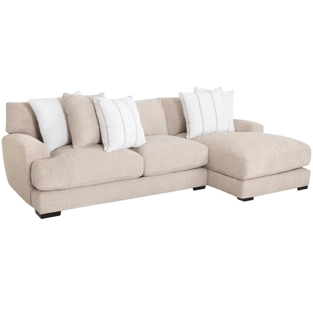 The right-facing Paris Chaise Sectional displays a plinth base of beech wood in a valyrian gold finish, paired with upholstered channel detailing along the inside and outside of the back. The piece is shown in gorgeous Monk Parchment 2213 fabric, accented with several configurable pillows and small welt trim in Noble String 2158 along the frame. The sectional features a chaise extension as well as six throw pillows in a variety of fabrics, one with a quartz crystal.