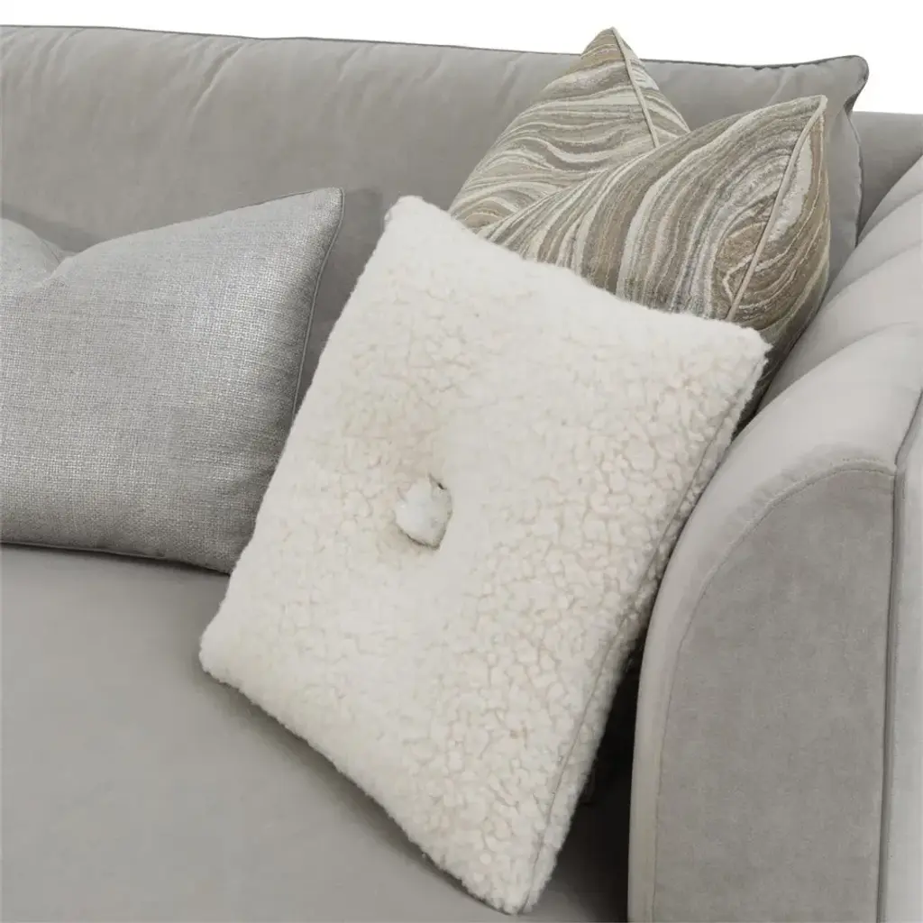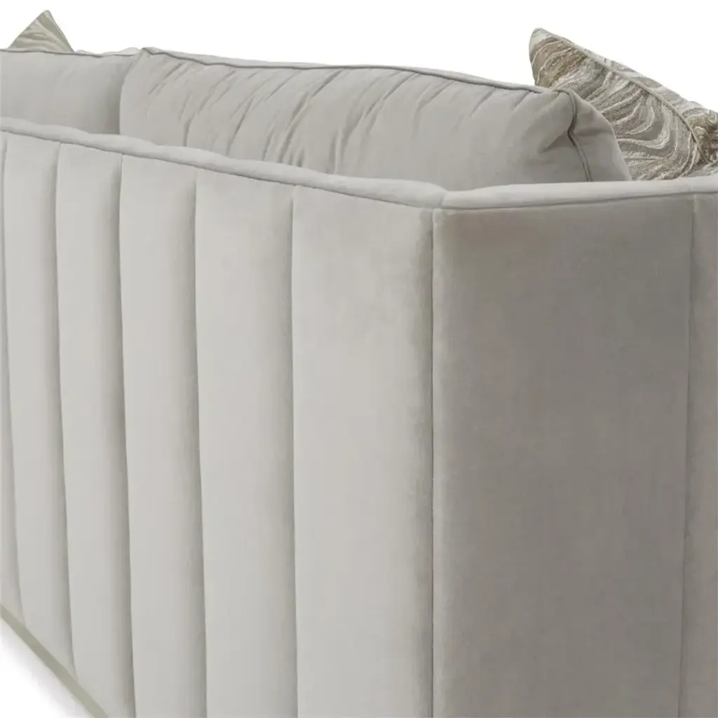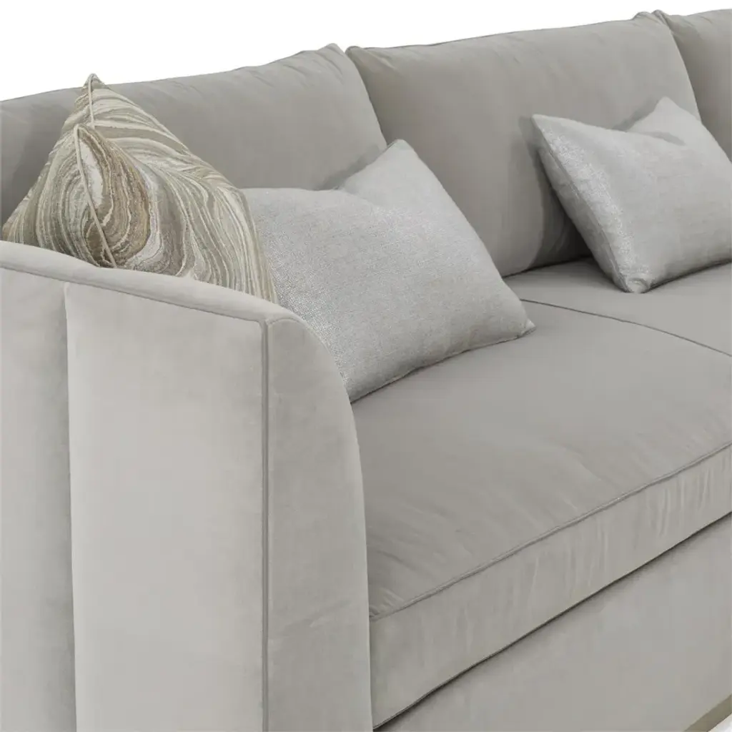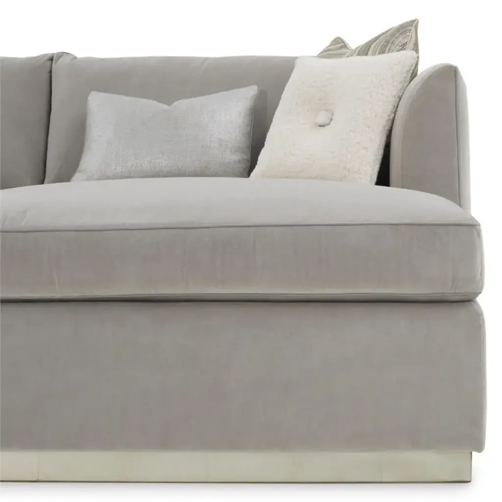 The Paris Chaise Sectional displays a plinth base of beech wood in a burnished silver finish, paired with upholstered channel detailing along the inside and outside of the back. The piece is shown in gorgeous Sintra Stone 2223 fabric, accented with several configurable pillows and small welt trim in Gimlet Platinum 1115 along the frame. The sectional features a chaise extension as well as six throw pillows in a variety of fabrics, one with a quartz crystal.