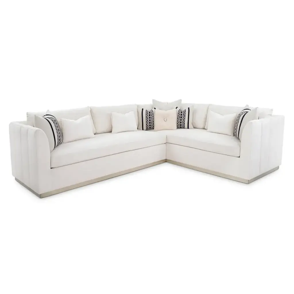 The right-facing Paris L-Sectional Sofa displays a plinth base of beech wood in burnished silver, paired with upholstered channel detailing along the inside and outside of the back. The piece is shown in gorgeous Nomad Snow 1109 fabric, accented with small welt trim in Gimlet String 1120 along the frame. Nine throw pillows in a variety of fabrics, one with a quartz crystal, complete the look.