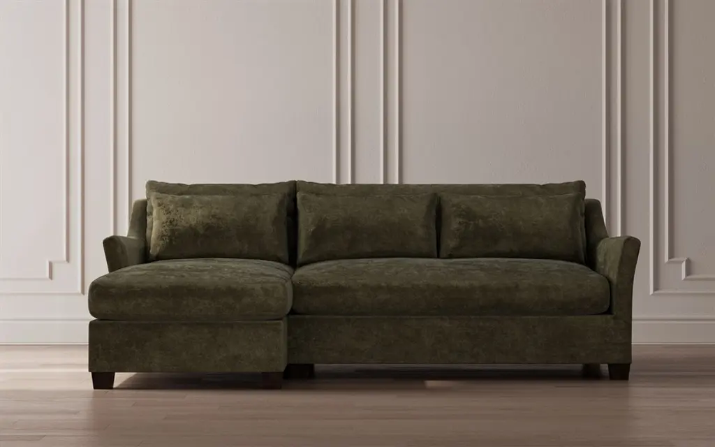 With its cozy cushioning and layered pillows, the left 101” Pauline chaise sectional is made for lounging. Gently sloped, flared arms and low, tapered wood legs add a refined element to the graceful silhouette. Soft yet supportive, the seat cushions are designed for plush comfort, with a foam core surrounded by a blend of fiber, down, and feather fill. Choose from a variety of upholstery options, including linen, velvet, and performance fabrics.