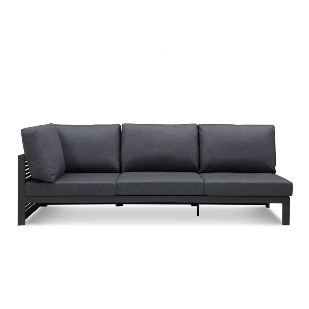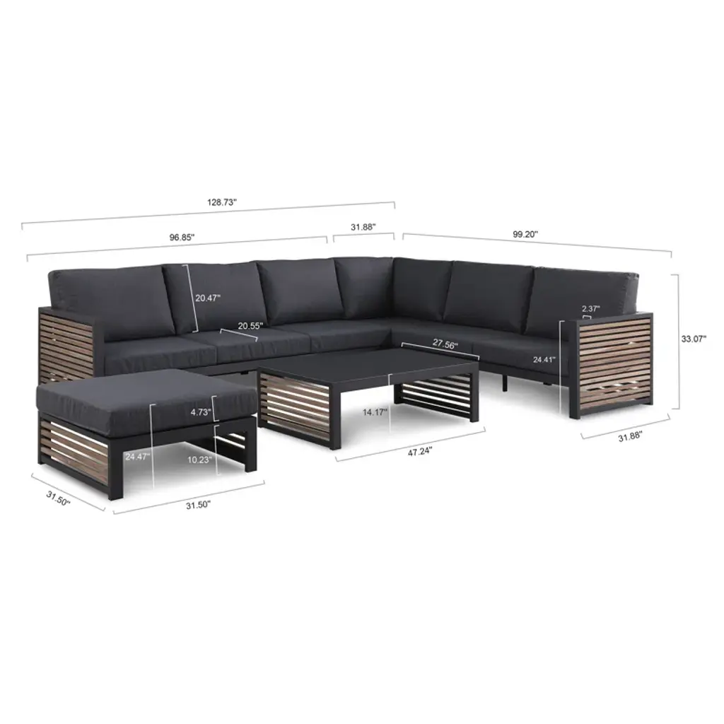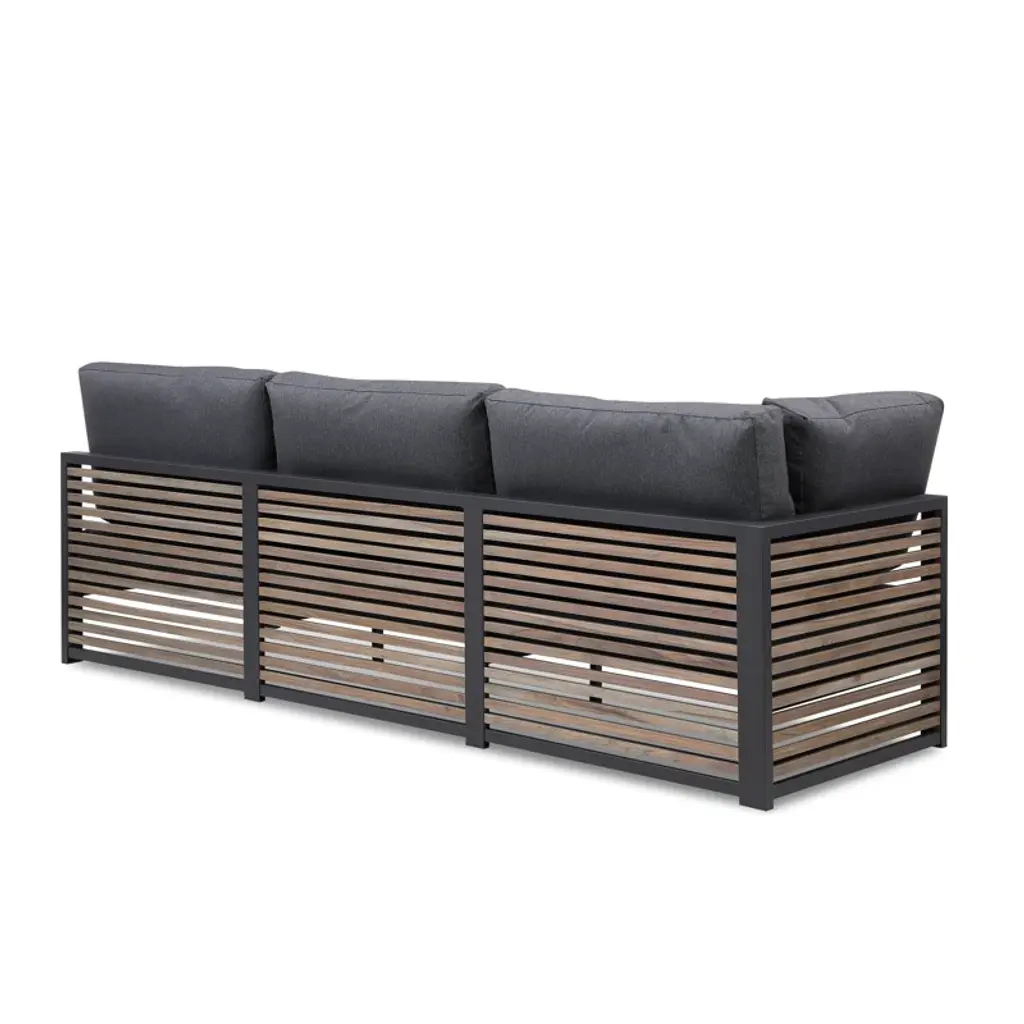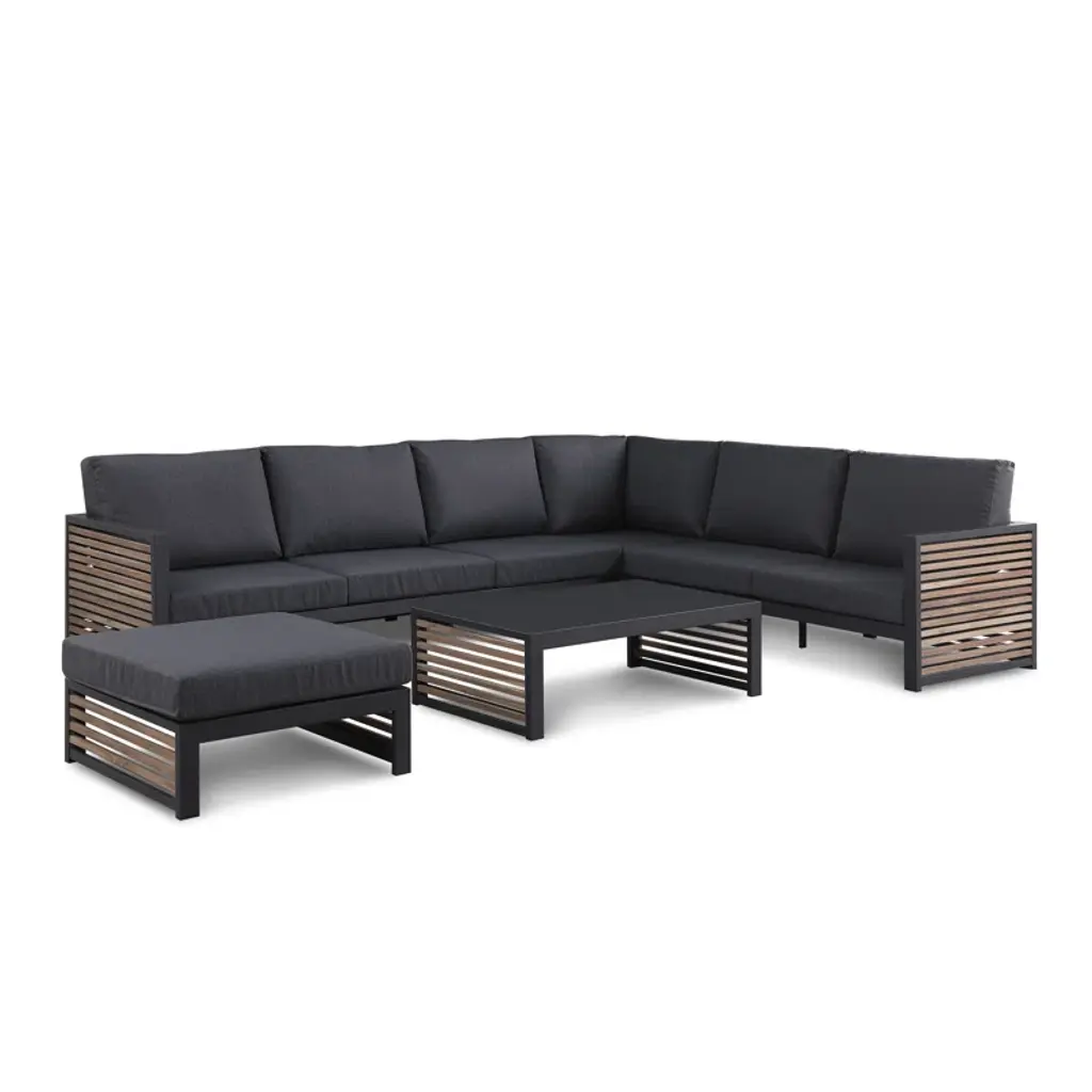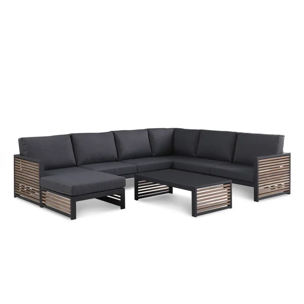 Enjoy in style with the Cadora corner lounge set 4-piece-arm Complement your garden or terrace with this high-quality lounge garden bench from the Cadora collection. This spacious corner lounge set 4-piece can accommodate all your guests and provides a luxurious look in your outdoor space. The combination of colors and materials makes this corner lounge set a real eye-catcher. This garden bench has an open look thanks to the horizontal application of teak. It can be perfectly combined with the other garden furniture from the Cadora collection. Properties The Cadora corner lounge set 4-piece arm is made of powder-coated aluminum in the color charcoal. Aluminum is relatively light, weather-resistant, strong, and requires little maintenance. The powder coating gives the paint layer better protection. The frame is finished with an inlay of teak wood that has been treated with an old teak grey wash. This gives the teak a grey finish. Due to the weather influences, the greywash will eventually disappear and the teak will get its gray color. It comes with comfortable cushions. The sturdy cushions can withstand a splash of water. The inside of the cushion covers has a thin, plastic coating. The cushion covers are detachable and can be washed cold. Our advice is also to store outdoor cushions when not in use. This way you can enjoy the comfortable cushions for a long time.